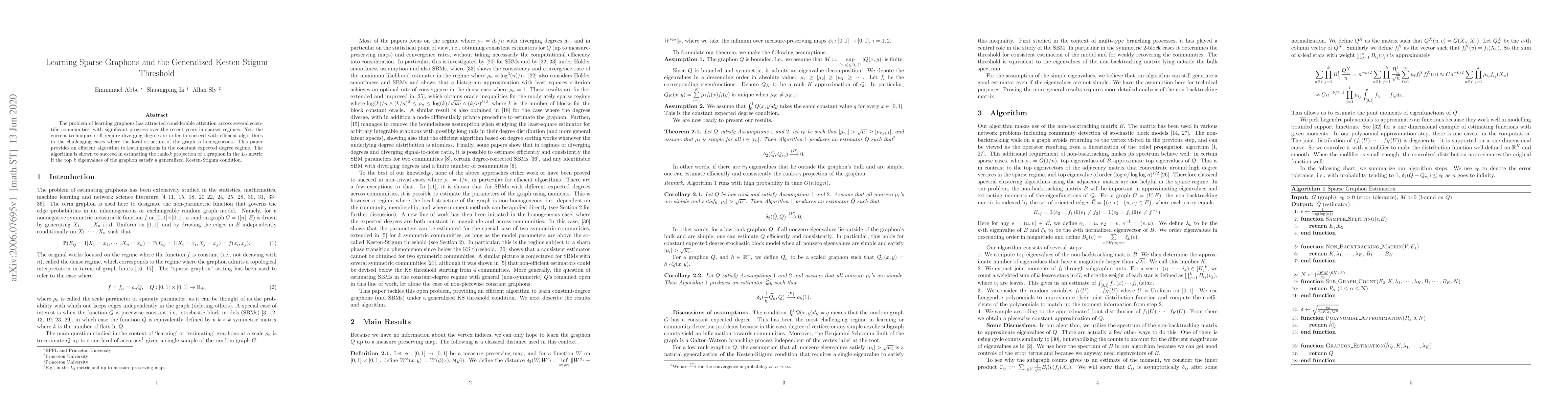 This paper presents an efficient algorithm for learning sparse graphons with constant expected degrees, achieving successful estimation of the rank-$k$ projection under a generalized Kesten-Stigum condition on the graphon's eigenvalues.