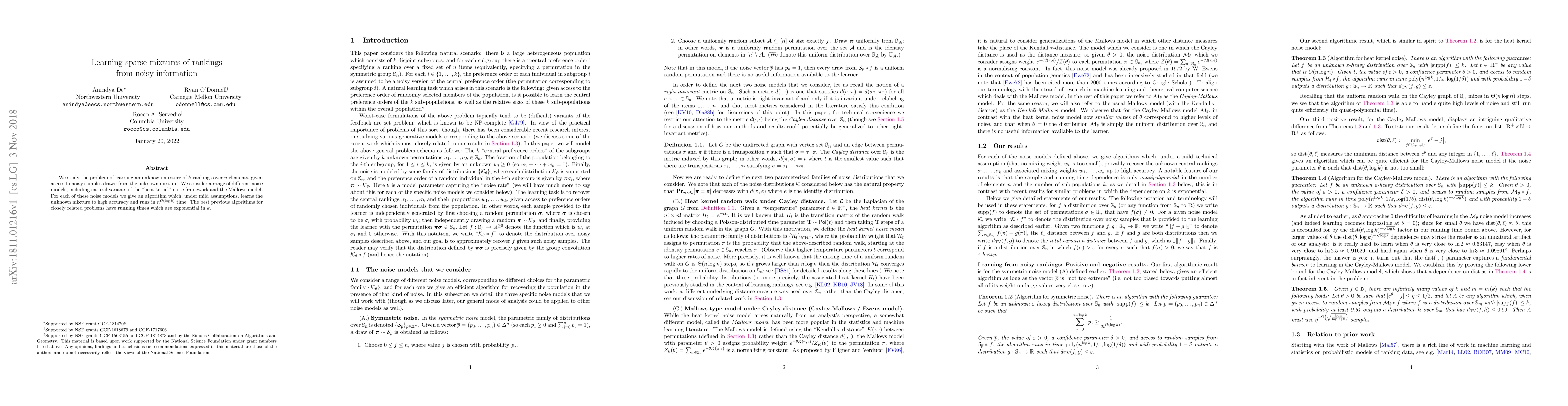 This paper proposes algorithms to learn sparse mixtures of $k$ rankings over $n$ elements from noisy samples, under various noise models like heat kernel and Mallows. The proposed algorithms achieve high accuracy and run in $n^{O(\log k)}$ time, significantly improving on previous exponential-time algorithms.