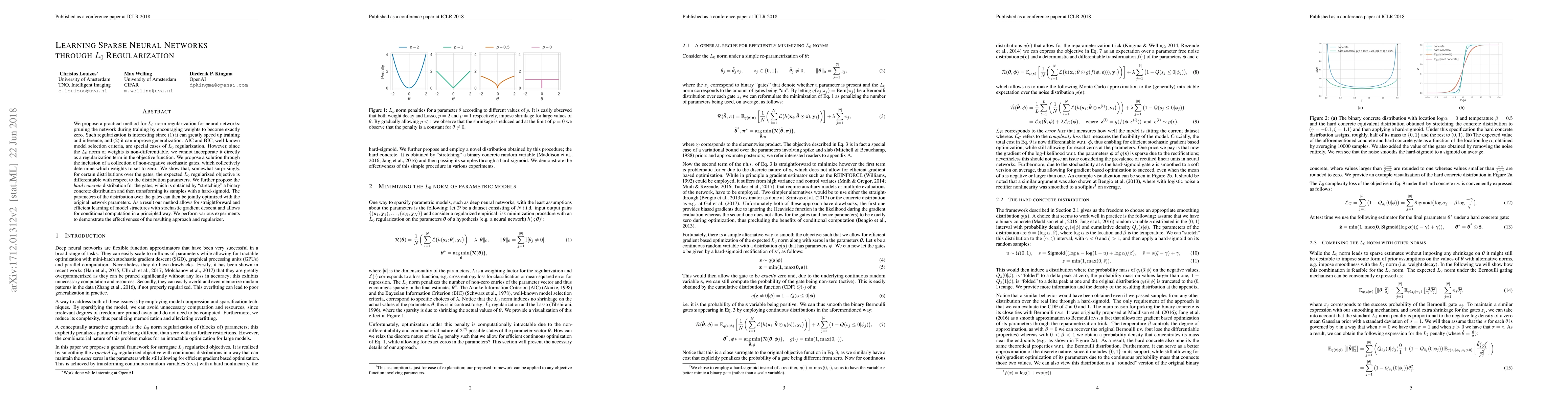 This paper proposes a method for $L_0$ norm regularization in neural networks through the use of stochastic gates to encourage weight sparsity, enabling faster training and improved generalization. The hard concrete distribution is introduced for differentiable approximation of the non-differentiable $L_0$ norm, facilitating efficient learning via stochastic gradient descent.