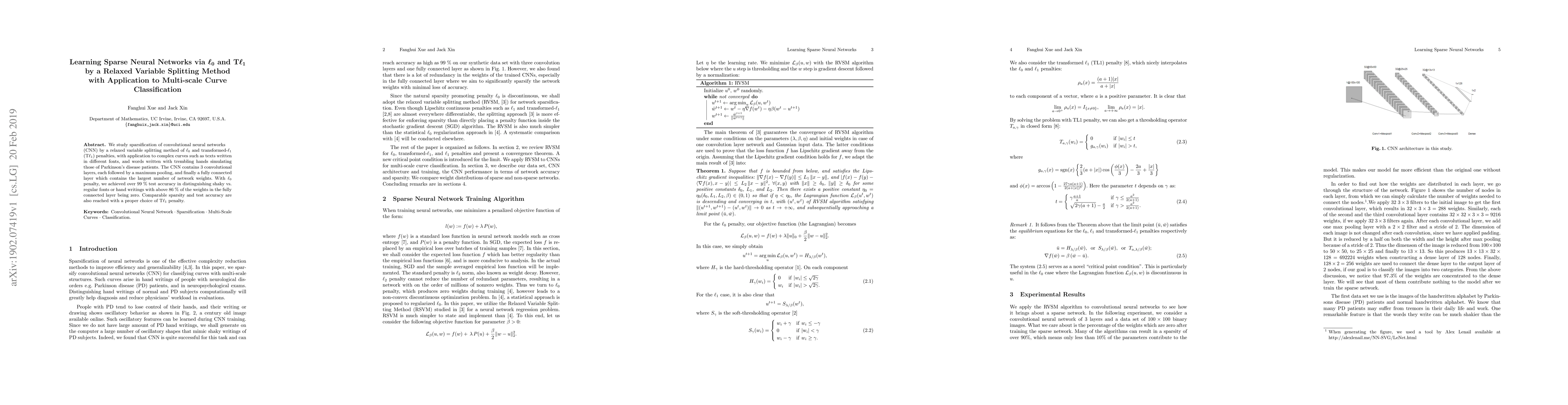 This paper proposes a relaxed variable splitting method using $\ell_0$ and transformed-$\ell_1$ (T$\ell_1$) penalties for sparsifying convolutional neural networks (CNNs), achieving over 99% test accuracy in classifying multi-scale curves like handwritten texts. The method effectively reduces the fully connected layer weights by over 86%, demonstrating its efficacy in distinguishing shaky from regular handwriting.