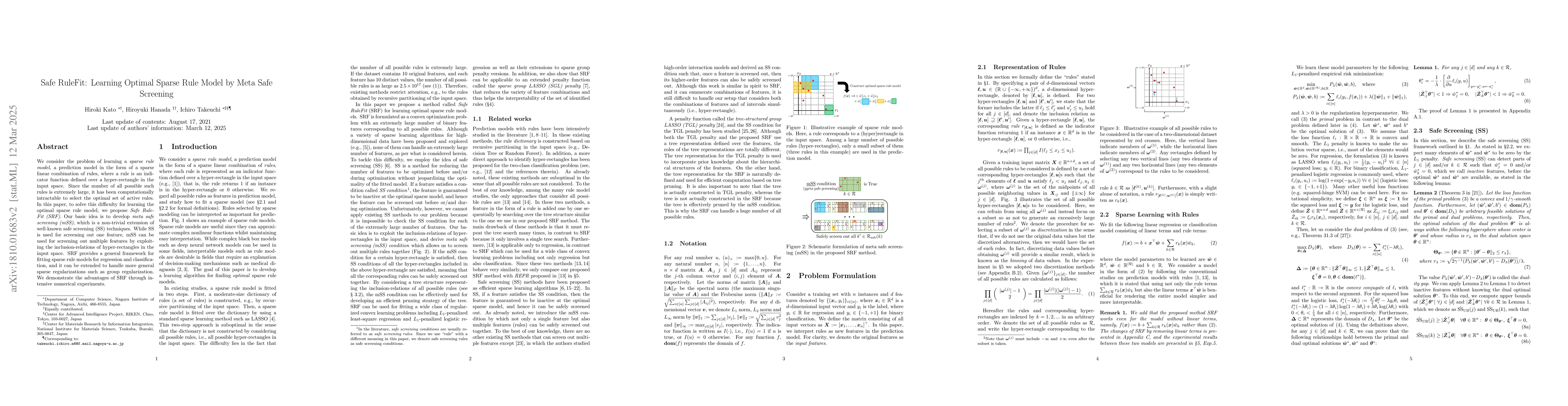 This paper proposes Safe Optimal Rule Fit (SORF) to efficiently learn sparse linear prediction models from a large set of potential rules. SORF leverages safe screening and a tree representation to prune irrelevant rules, enabling efficient model fitting and demonstrated effectiveness through benchmark datasets.