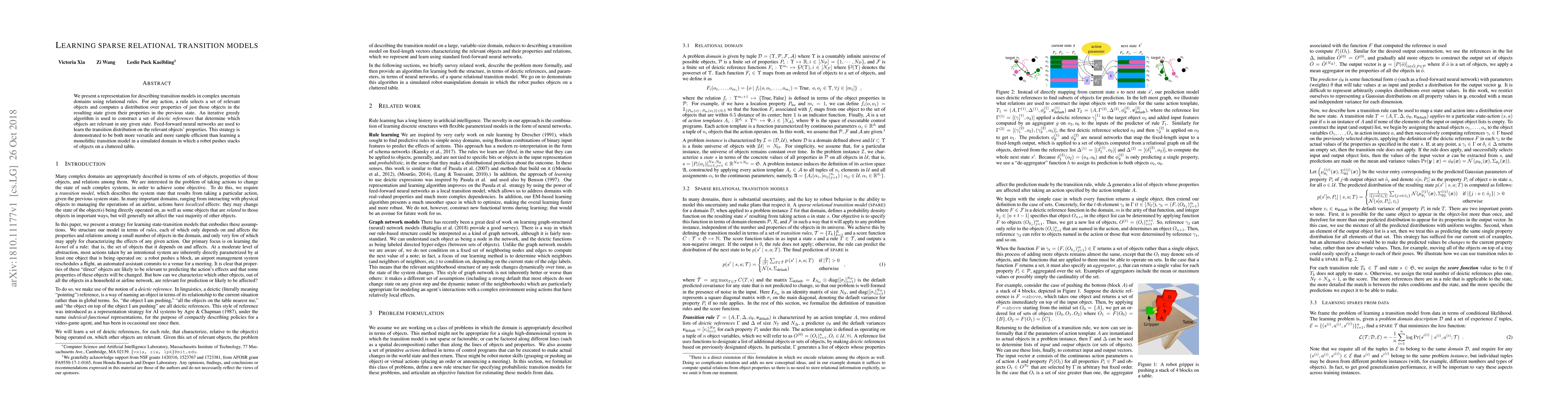 We present a representation for describing transition models in complex uncertain domains using relational rules. For any action, a rule selects a set of relevant objects and computes a distribution over properties of just those objects in the resulting state given their properties in the previous state. An iterative greedy algorithm is used to construct a set of deictic references that determine which objects are relevant in any given state. Feed-forward neural networks are used to learn the transition distribution on the relevant objects' properties. This strategy is demonstrated to be both more versatile and more sample efficient than learning a monolithic transition model in a simulated domain in which a robot pushes stacks of objects on a cluttered table.