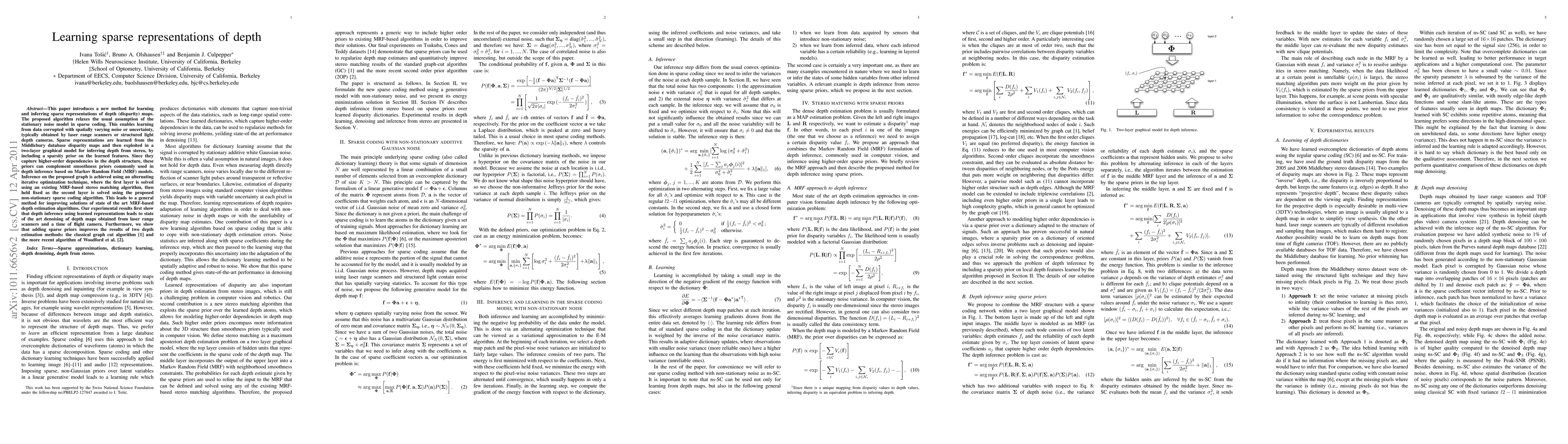This paper introduces a new method for learning and inferring sparse representations of depth (disparity) maps. The proposed algorithm relaxes the usual assumption of the stationary noise model in sparse coding. This enables learning from data corrupted with spatially varying noise or uncertainty, typically obtained by laser range scanners or structured light depth cameras. Sparse representations are learned from the Middlebury database disparity maps and then exploited in a two-layer graphical model for inferring depth from stereo, by including a sparsity prior on the learned features. Since they capture higher-order dependencies in the depth structure, these priors can complement smoothness priors commonly used in depth inference based on Markov Random Field (MRF) models. Inference on the proposed graph is achieved using an alternating iterative optimization technique, where the first layer is solved using an existing MRF-based stereo matching algorithm, then held fixed as the second layer is solved using the proposed non-stationary sparse coding algorithm. This leads to a general method for improving solutions of state of the art MRF-based depth estimation algorithms. Our experimental results first show that depth inference using learned representations leads to state of the art denoising of depth maps obtained from laser range scanners and a time of flight camera. Furthermore, we show that adding sparse priors improves the results of two depth estimation methods: the classical graph cut algorithm by Boykov et al. and the more recent algorithm of Woodford et al.