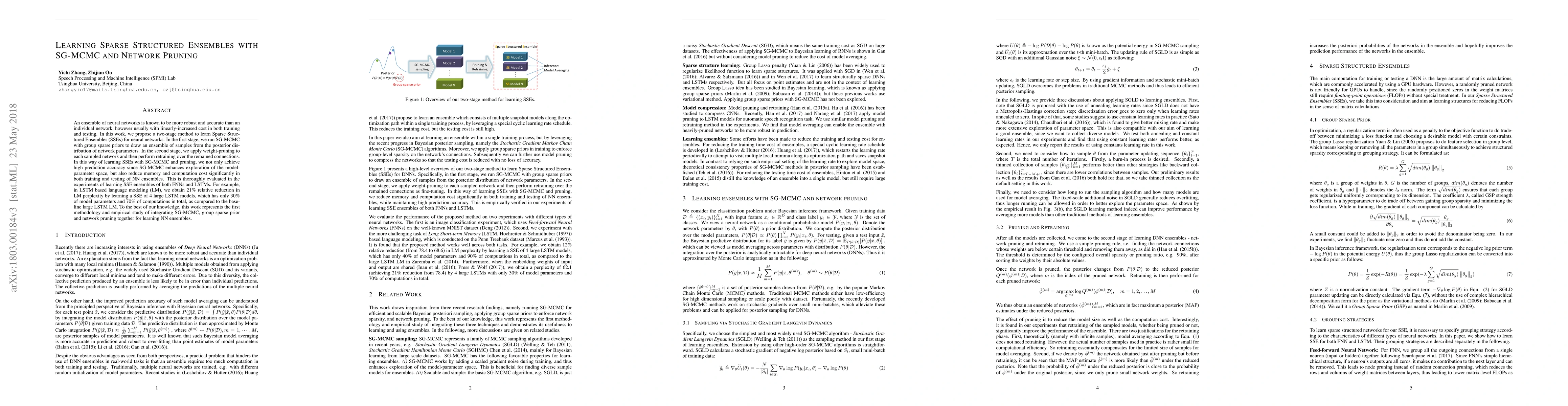 This paper proposes a two-stage method to learn Sparse Structured Ensembles (SSEs) using SG-MCMC and network pruning, achieving high prediction accuracy while significantly reducing memory and computation costs. Experiments show a 21% reduction in perplexity for LSTM-based language modeling with a 70% reduction in computations.