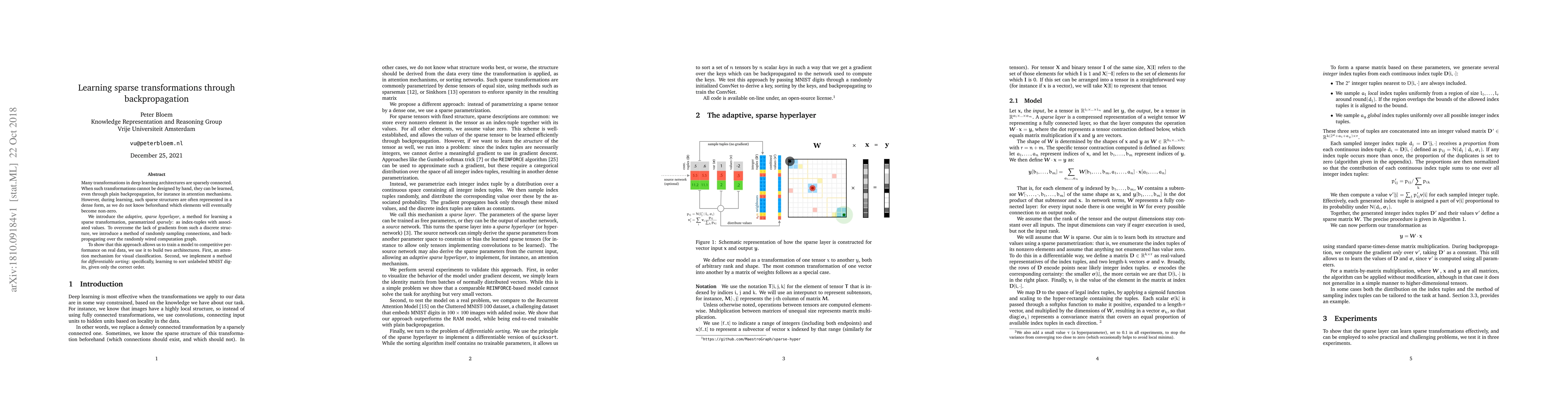 This paper introduces an adaptive sparse hyperlayer for learning sparse transformations through backpropagation, addressing the challenge of sparse structures by randomly sampling connections and using a differentiable sorting method to train models for visual classification and sorting unlabeled MNIST digits.