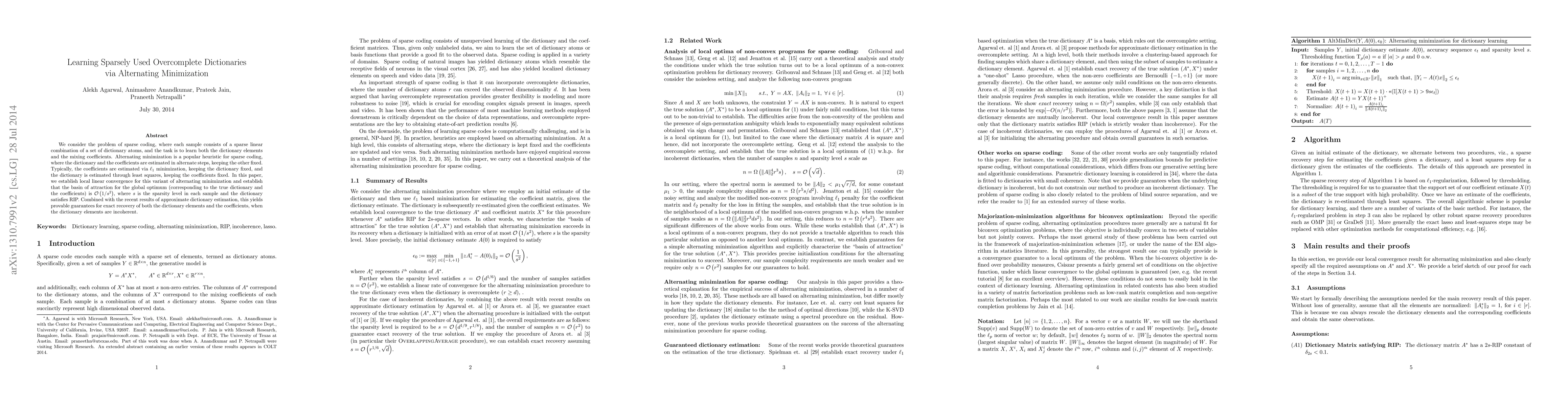 This paper investigates sparse coding using alternating minimization, proving local linear convergence and establishing a convergence basin proportional to the inverse square of the sparsity level, under conditions of dictionary incoherence and RIP satisfaction. This provides theoretical guarantees for accurate recovery of both dictionary elements and mixing coefficients.