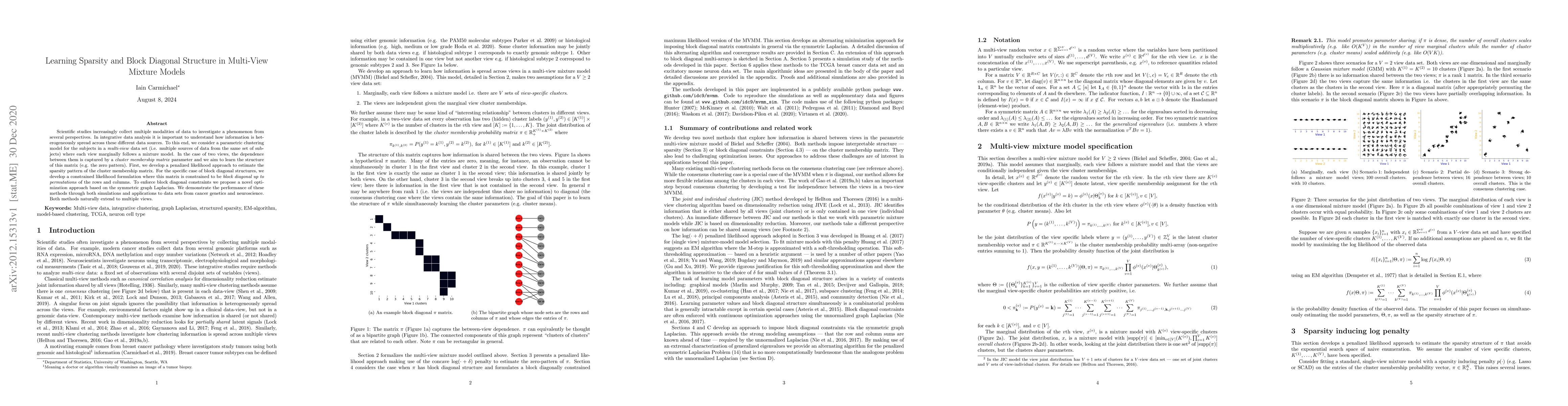 This paper proposes penalized likelihood and constrained optimization methods to learn sparsity and block diagonal structures in multi-view mixture models, demonstrating their effectiveness through simulations and applications in cancer genetics and neuroscience. The novel optimization approach uses the symmetric graph Laplacian to enforce block diagonal constraints.