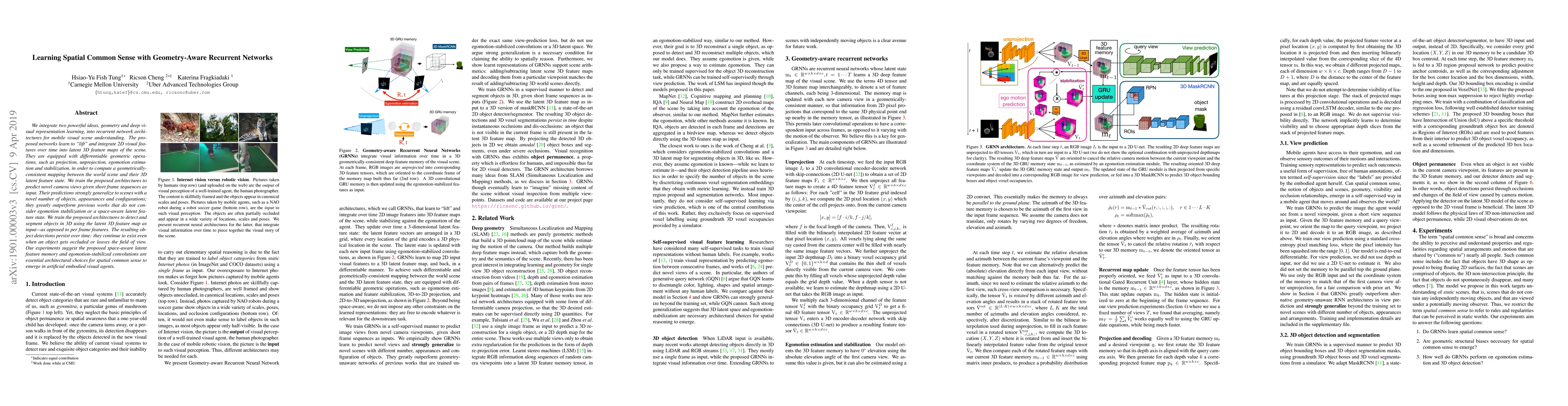 We integrate two powerful ideas, geometry and deep visual representation learning, into recurrent network architectures for mobile visual scene understanding. The proposed networks learn to "lift" and integrate 2D visual features over time into latent 3D feature maps of the scene. They are equipped with differentiable geometric operations, such as projection, unprojection, egomotion estimation and stabilization, in order to compute a geometrically-consistent mapping between the world scene and their 3D latent feature state. We train the proposed architectures to predict novel camera views given short frame sequences as input. Their predictions strongly generalize to scenes with a novel number of objects, appearances and configurations; they greatly outperform previous works that do not consider egomotion stabilization or a space-aware latent feature state. We train the proposed architectures to detect and segment objects in 3D using the latent 3D feature map as input--as opposed to per frame features. The resulting object detections persist over time: they continue to exist even when an object gets occluded or leaves the field of view. Our experiments suggest the proposed space-aware latent feature memory and egomotion-stabilized convolutions are essential architectural choices for spatial common sense to emerge in artificial embodied visual agents.