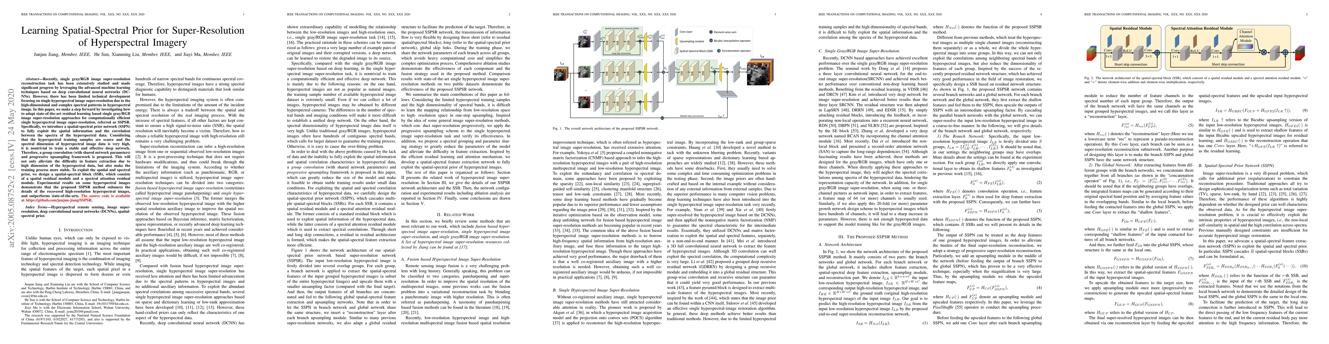 This paper proposes a spatial-spectral prior network (SSPN) for super-resolution of hyperspectral imagery, utilizing a spatial-spectral block to exploit spatial information and spectral correlations. The method employs a group convolution and progressive upsampling to handle high-dimensional data and improve training stability, achieving superior results compared to existing methods.