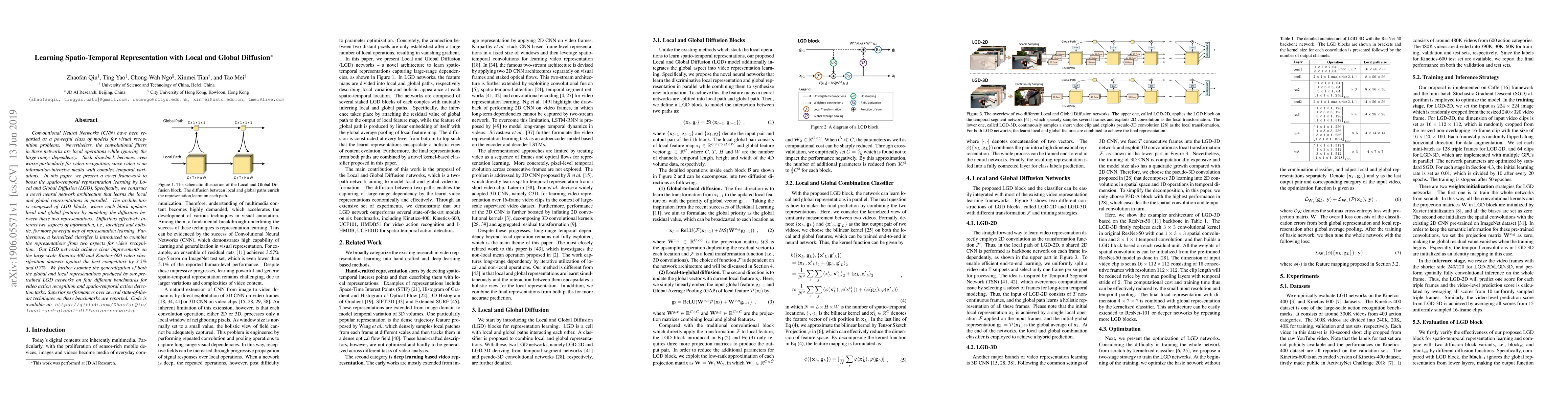 A new neural network architecture, Local and Global Diffusion (LGD), improves spatio-temporal representation learning for video recognition tasks, achieving 3.5% and 0.7% improvements over state-of-the-art models on Kinetics-400 and Kinetics-600 datasets.