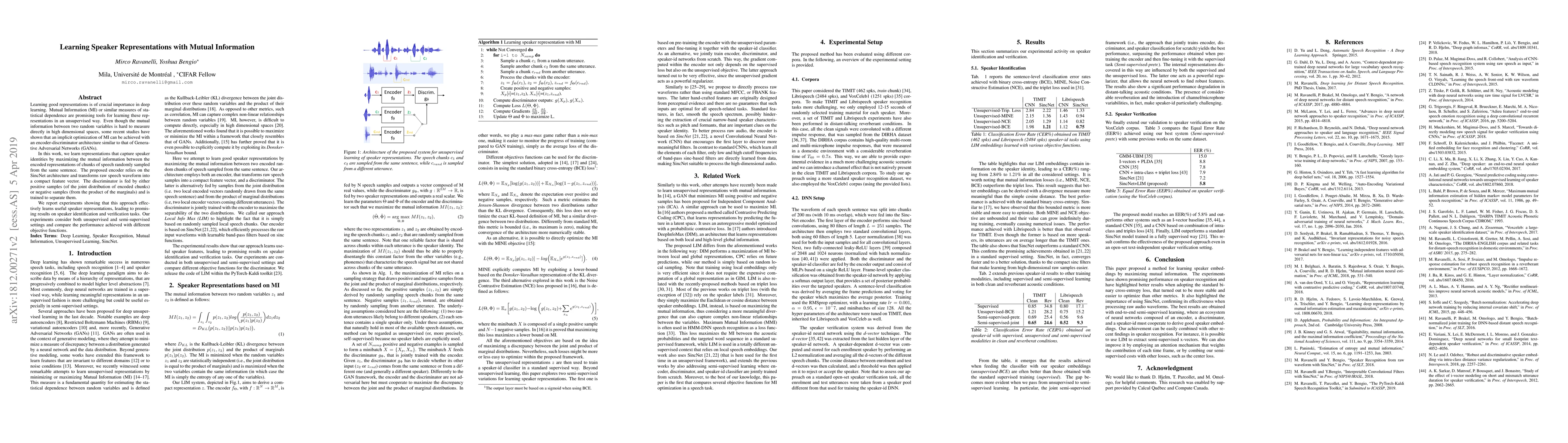 This paper proposes an unsupervised learning method using mutual information to derive speaker representations via an encoder-discriminator architecture, achieving effective speaker identification and verification in both unsupervised and semi-supervised settings. The method leverages the SincNet architecture for encoding speech waveforms and trains the discriminator to maximize mutual information between encoded speech chunks.