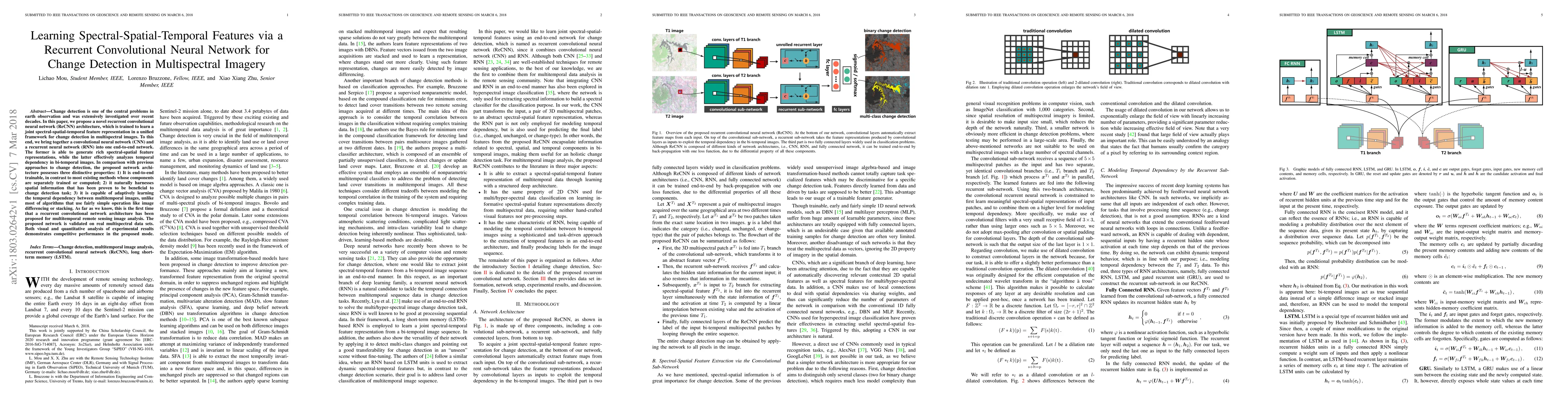 This paper proposes a novel recurrent convolutional neural network (ReCNN) for change detection in multispectral imagery, combining CNN and RNN to learn spectral-spatial-temporal features. The ReCNN architecture is end-to-end trainable, leverages spatial information, and adaptively learns temporal dependencies, demonstrating competitive performance on multispectral datasets.