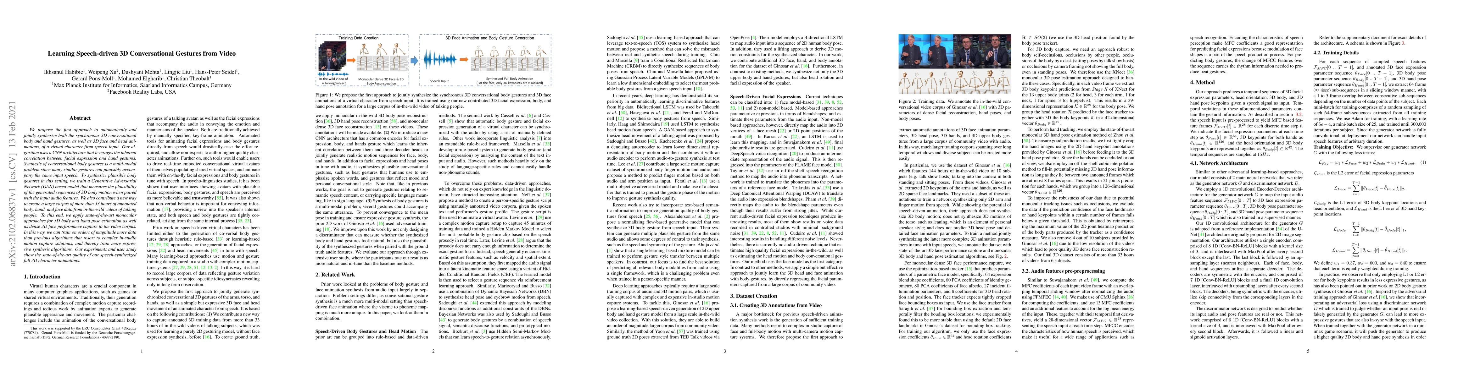 This paper proposes a novel CNN-based algorithm to synthesize 3D conversational gestures and animations from speech input, leveraging a GAN to generate plausible body gestures. It also introduces a large annotated dataset from in-the-wild videos, enabling the training of more expressive synthesis models compared to previous in-studio methods.