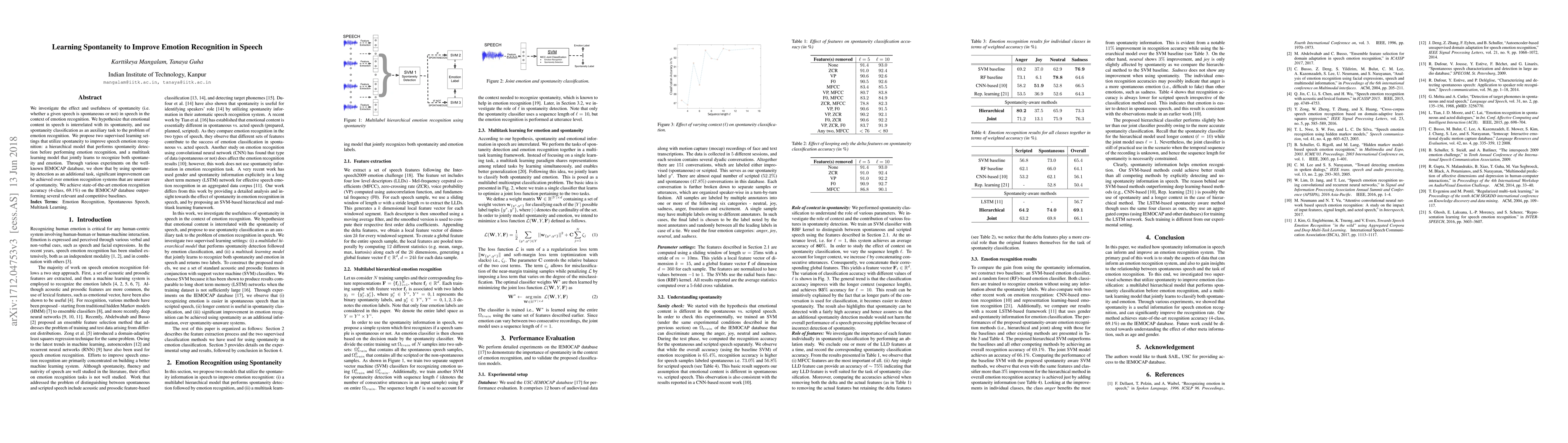 This paper explores how incorporating spontaneity detection into speech emotion recognition can enhance accuracy. By classifying speech as spontaneous or not, the authors propose two learning models that leverage this information, achieving state-of-the-art results on the IEMOCAP database.