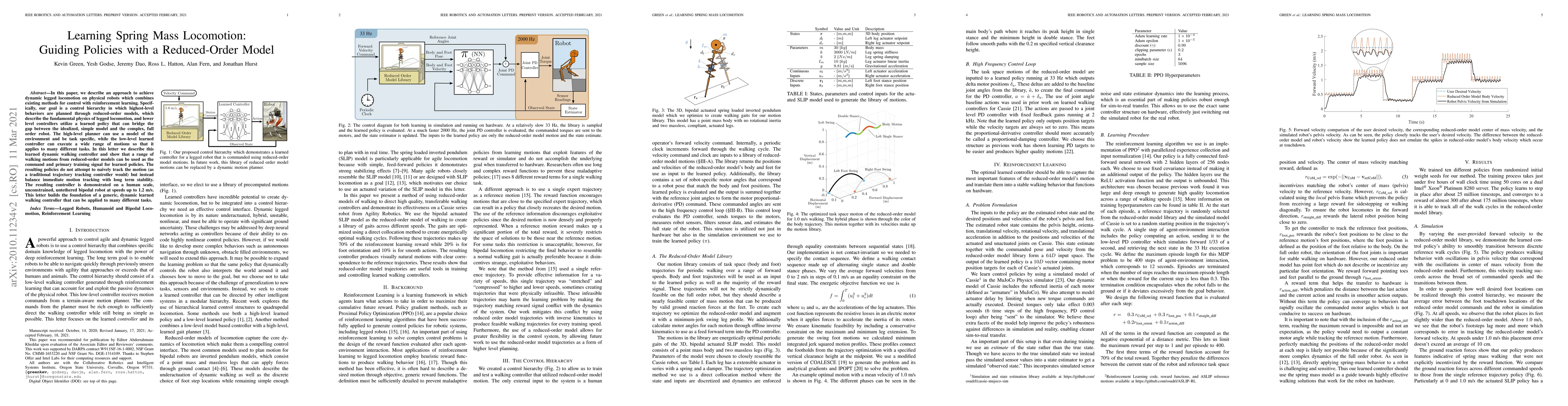In this paper, we describe an approach to achieve dynamic legged locomotion on physical robots which combines existing methods for control with reinforcement learning. Specifically, our goal is a control hierarchy in which highest-level behaviors are planned through reduced-order models, which describe the fundamental physics of legged locomotion, and lower level controllers utilize a learned policy that can bridge the gap between the idealized, simple model and the complex, full order robot. The high-level planner can use a model of the environment and be task specific, while the low-level learned controller can execute a wide range of motions so that it applies to many different tasks. In this letter we describe this learned dynamic walking controller and show that a range of walking motions from reduced-order models can be used as the command and primary training signal for learned policies. The resulting policies do not attempt to naively track the motion (as a traditional trajectory tracking controller would) but instead balance immediate motion tracking with long term stability. The resulting controller is demonstrated on a human scale, unconstrained, untethered bipedal robot at speeds up to 1.2 m/s. This letter builds the foundation of a generic, dynamic learned walking controller that can be applied to many different tasks.