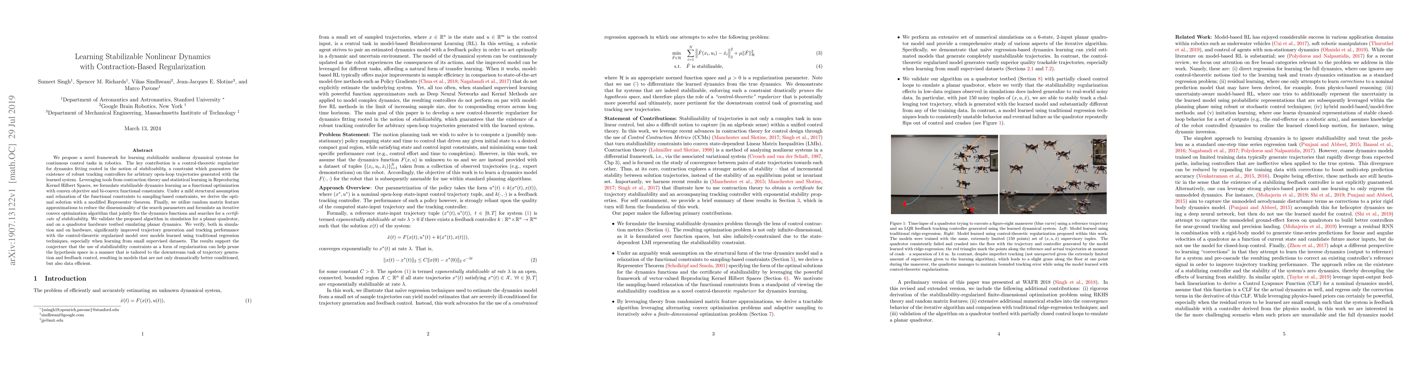 We propose a novel framework for learning stabilizable nonlinear dynamical systems for continuous control tasks in robotics. The key contribution is a control-theoretic regularizer for dynamics fitting rooted in the notion of stabilizability, a constraint which guarantees the existence of robust tracking controllers for arbitrary open-loop trajectories generated with the learned system. Leveraging tools from contraction theory and statistical learning in Reproducing Kernel Hilbert Spaces, we formulate stabilizable dynamics learning as a functional optimization with convex objective and bi-convex functional constraints. Under a mild structural assumption and relaxation of the functional constraints to sampling-based constraints, we derive the optimal solution with a modified Representer theorem. Finally, we utilize random matrix feature approximations to reduce the dimensionality of the search parameters and formulate an iterative convex optimization algorithm that jointly fits the dynamics functions and searches for a certificate of stabilizability. We validate the proposed algorithm in simulation for a planar quadrotor, and on a quadrotor hardware testbed emulating planar dynamics. We verify, both in simulation and on hardware, significantly improved trajectory generation and tracking performance with the control-theoretic regularized model over models learned using traditional regression techniques, especially when learning from small supervised datasets. The results support the conjecture that the use of stabilizability constraints as a form of regularization can help prune the hypothesis space in a manner that is tailored to the downstream task of trajectory generation and feedback control, resulting in models that are not only dramatically better conditioned, but also data efficient.