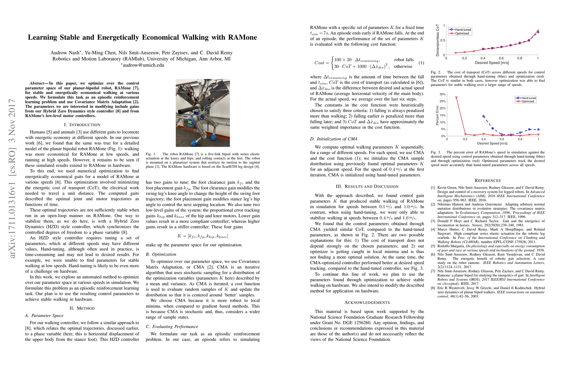 Researchers optimized a bipedal robot's control parameters to achieve stable and energetically economical walking at various speeds through reinforcement learning.