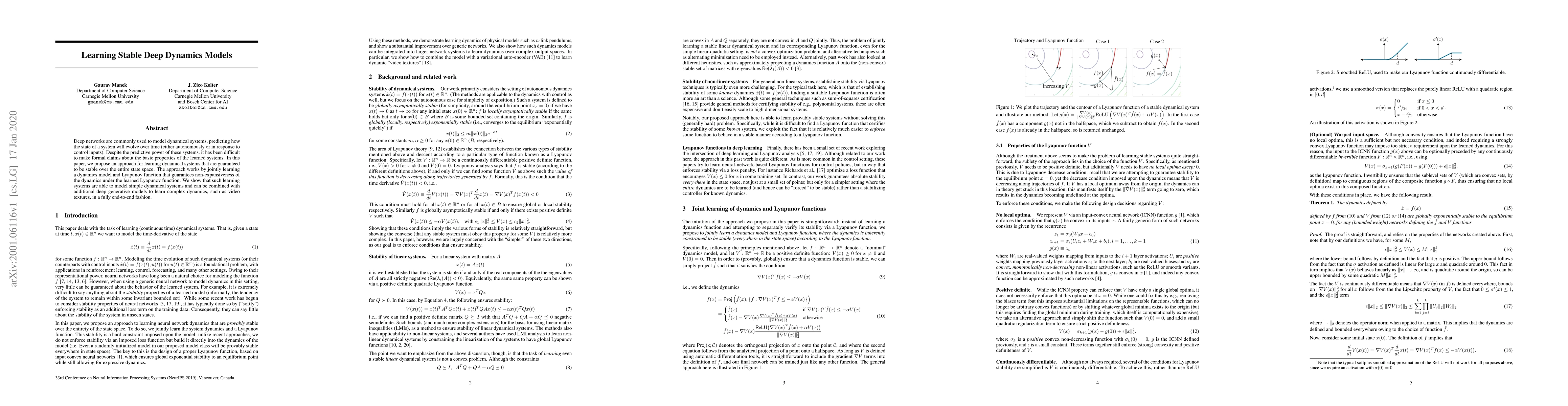 This paper proposes a method to learn stable deep dynamical systems by jointly training a dynamics model and a Lyapunov function, ensuring stability over the entire state space. The approach enables modeling of simple systems and complex dynamics like video textures through end-to-end learning.