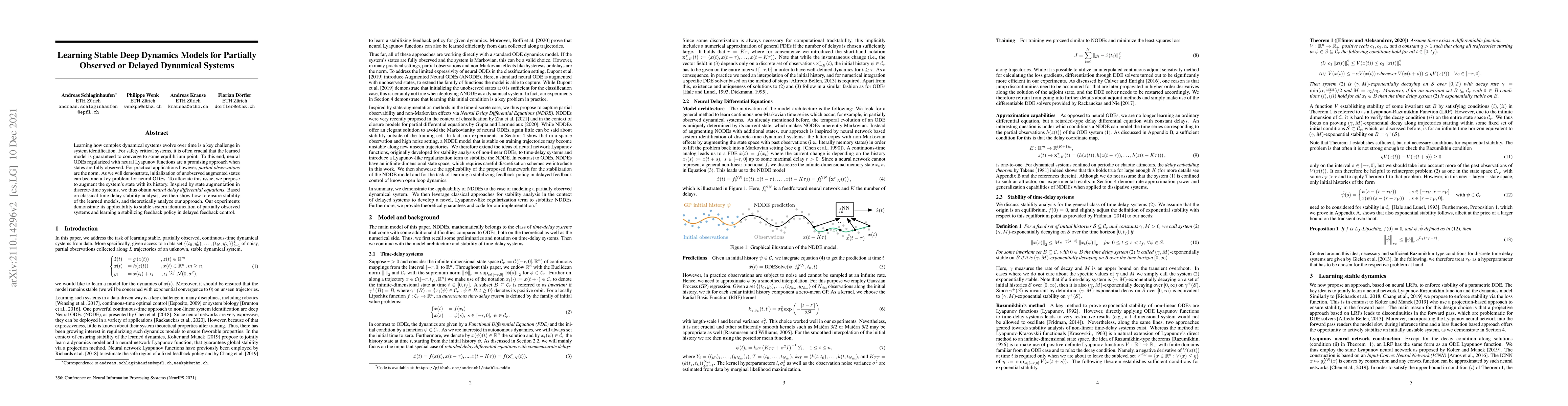 Learning how complex dynamical systems evolve over time is a key challenge in system identification. For safety critical systems, it is often crucial that the learned model is guaranteed to converge to some equilibrium point. To this end, neural ODEs regularized with neural Lyapunov functions are a promising approach when states are fully observed. For practical applications however, partial observations are the norm. As we will demonstrate, initialization of unobserved augmented states can become a key problem for neural ODEs. To alleviate this issue, we propose to augment the system's state with its history. Inspired by state augmentation in discrete-time systems, we thus obtain neural delay differential equations. Based on classical time delay stability analysis, we then show how to ensure stability of the learned models, and theoretically analyze our approach. Our experiments demonstrate its applicability to stable system identification of partially observed systems and learning a stabilizing feedback policy in delayed feedback control.