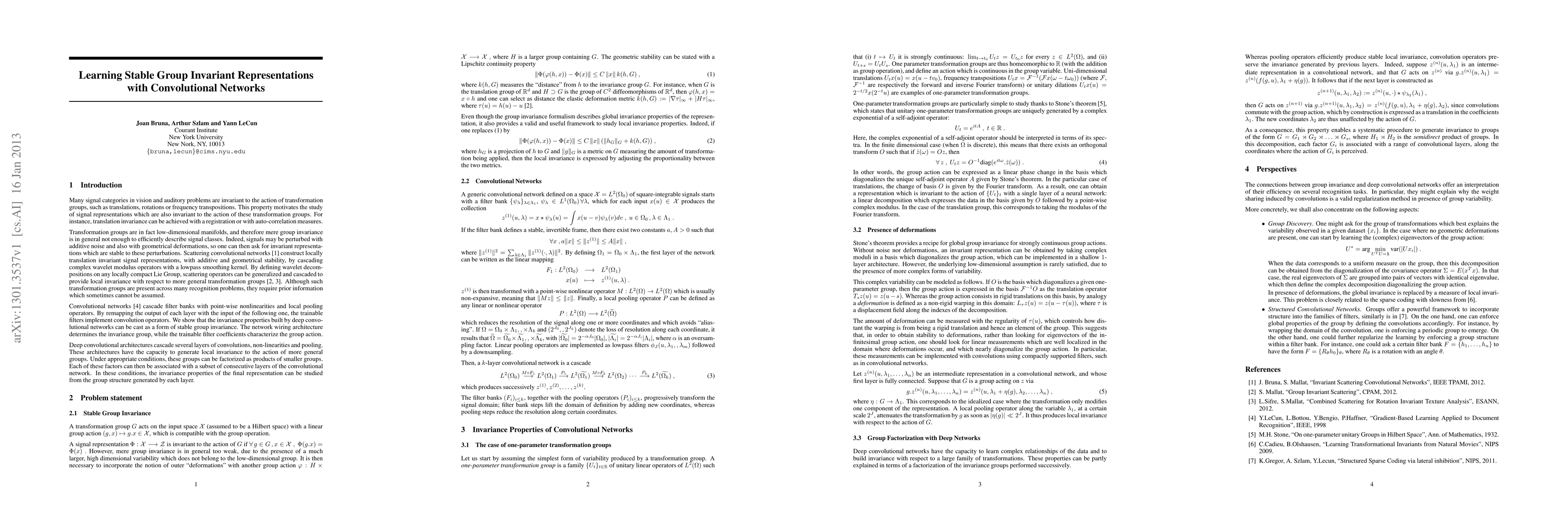Deep convolutional networks can exhibit stable group invariance based on their architecture, allowing them to generalize across transformations of the input data. This property enables powerful invariant representations for complex signal classes.