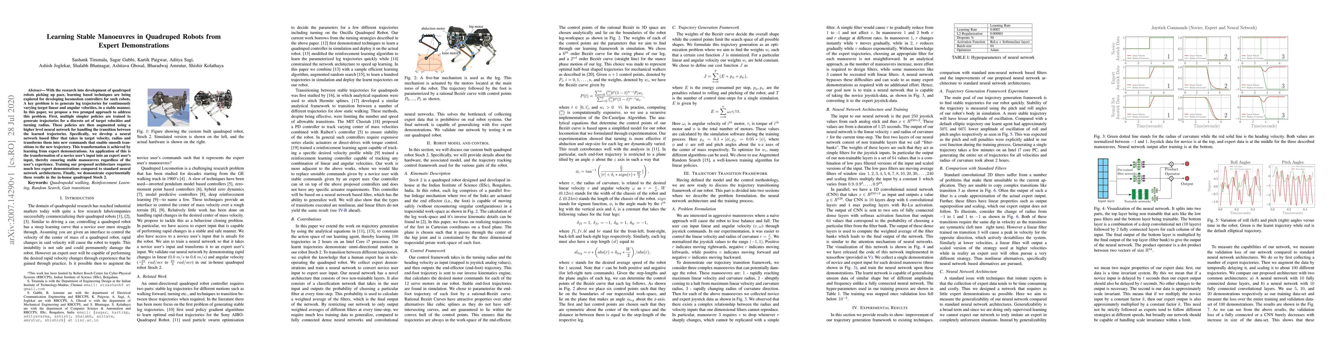 This paper proposes a two-pronged approach to enable quadruped robots to learn stable manoeuvres from expert demonstrations. It combines simpler trained policies for discrete velocities and a neural network filter for smooth transitions, requiring fewer expert examples than standard methods.