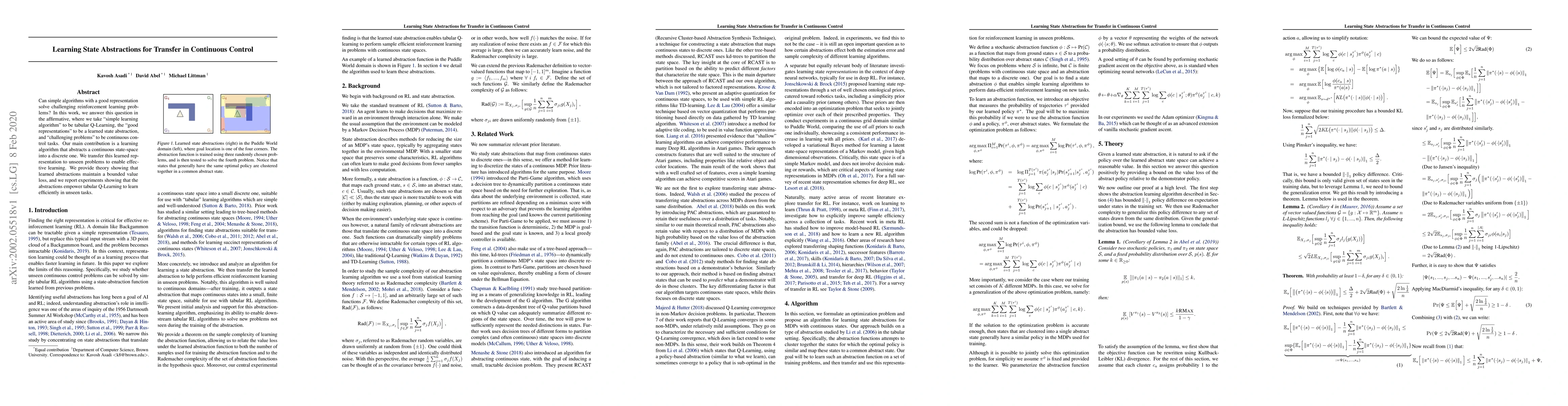 Can simple algorithms with a good representation solve challenging reinforcement learning problems? In this work, we answer this question in the affirmative, where we take "simple learning algorithm" to be tabular Q-Learning, the "good representations" to be a learned state abstraction, and "challenging problems" to be continuous control tasks. Our main contribution is a learning algorithm that abstracts a continuous state-space into a discrete one. We transfer this learned representation to unseen problems to enable effective learning. We provide theory showing that learned abstractions maintain a bounded value loss, and we report experiments showing that the abstractions empower tabular Q-Learning to learn efficiently in unseen tasks.