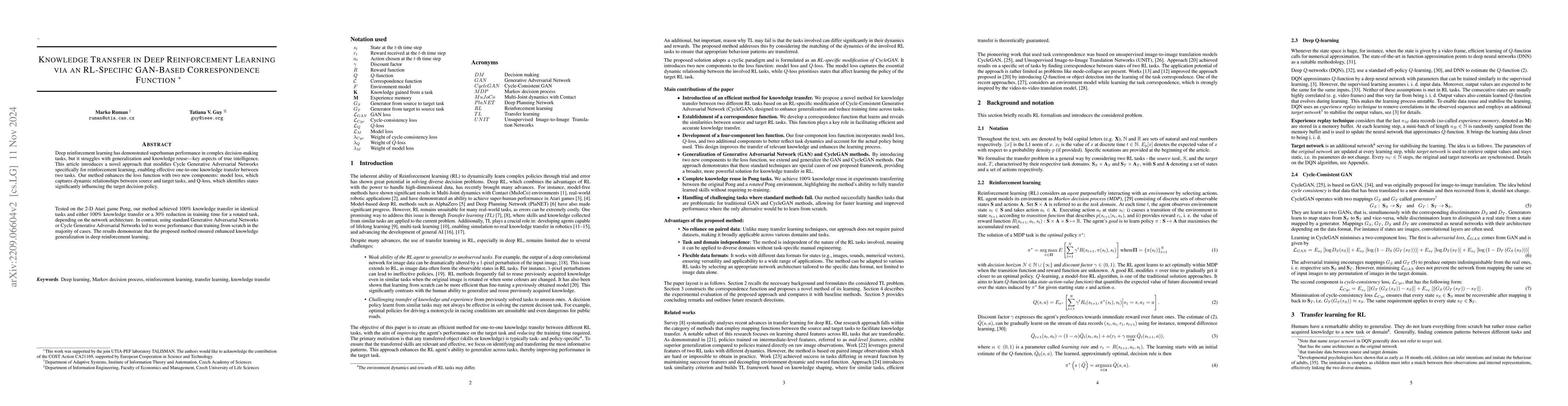 This paper proposes a method using a generative adversarial network to enable knowledge transfer between reinforcement learning tasks, aiming to generalize and reuse learned knowledge for solving new, unseen tasks. The approach seeks to create a more intelligent agent capable of leveraging past experiences.