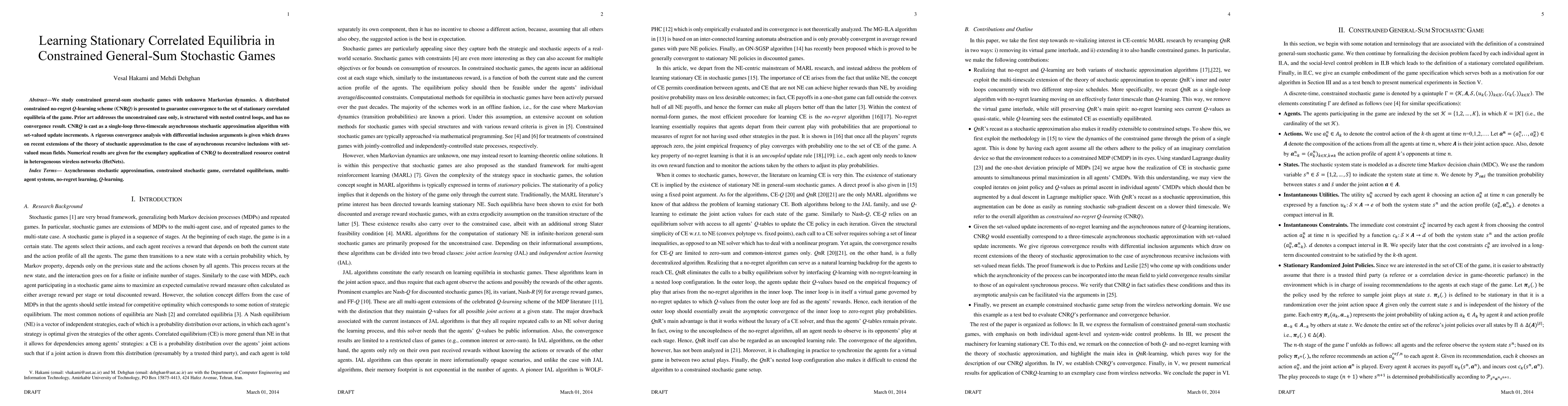 We study constrained general-sum stochastic games with unknown Markovian dynamics. A distributed constrained no-regret Q-learning scheme (CNRQ) is presented to guarantee convergence to the set of stationary correlated equilibria of the game. Prior art addresses the unconstrained case only, is structured with nested control loops, and has no convergence result. CNRQ is cast as a single-loop three-timescale asynchronous stochastic approximation algorithm with set-valued update increments. A rigorous convergence analysis with differential inclusion arguments is given which draws on recent extensions of the theory of stochastic approximation to the case of asynchronous recursive inclusions with set-valued mean fields. Numerical results are given for the exemplary application of CNRQ to decentralized resource control in heterogeneous wireless networks (HetNets).