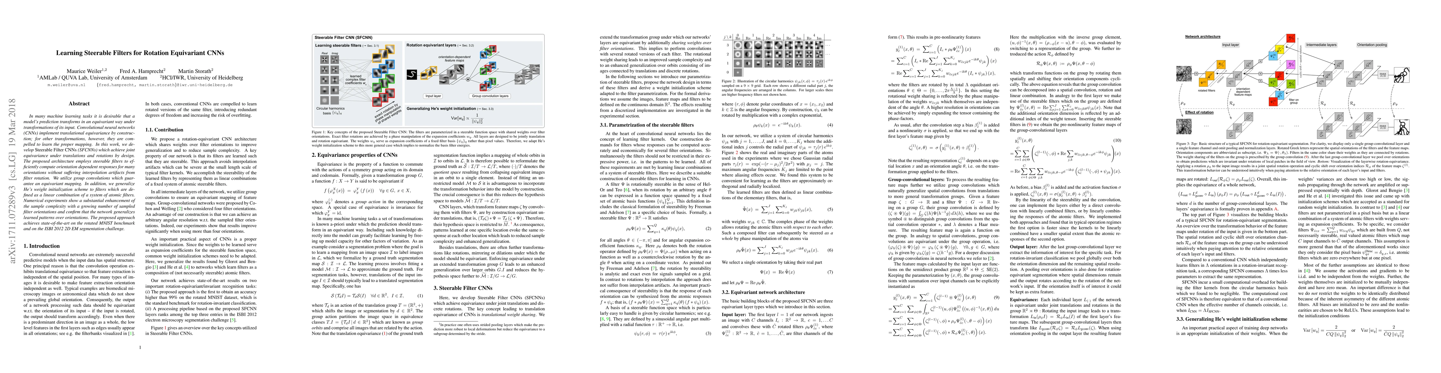 This paper introduces Steerable Filter CNNs (SFCNNs) that achieve equivariance under both translations and rotations through the use of steerable filters and group convolutions. The proposed method efficiently computes orientation-dependent responses and demonstrates state-of-the-art performance on rotation-invariant tasks.