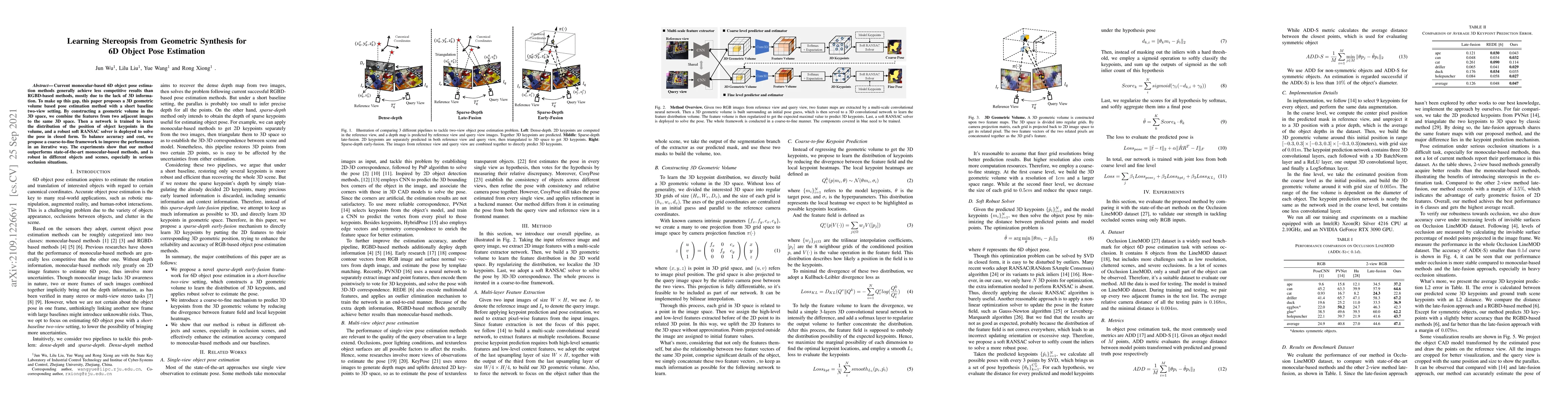 This paper proposes a novel 3D geometric volume-based method for 6D object pose estimation using monocular images, leveraging a short baseline two-view setup. The method combines features from two images into a 3D space, trains a network to learn keypoint positions, and uses a soft RANSAC solver for pose estimation, achieving better results than state-of-the-art monocular methods.