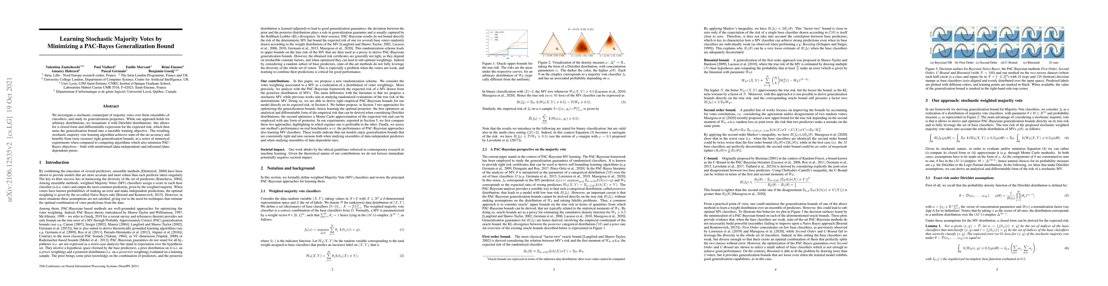 This paper proposes a stochastic majority vote learning algorithm that minimizes a PAC-Bayes generalization bound, instantiated with Dirichlet distributions for tractable training. The method achieves state-of-the-art accuracy and tight generalization bounds, outperforming competing algorithms in numerical experiments.