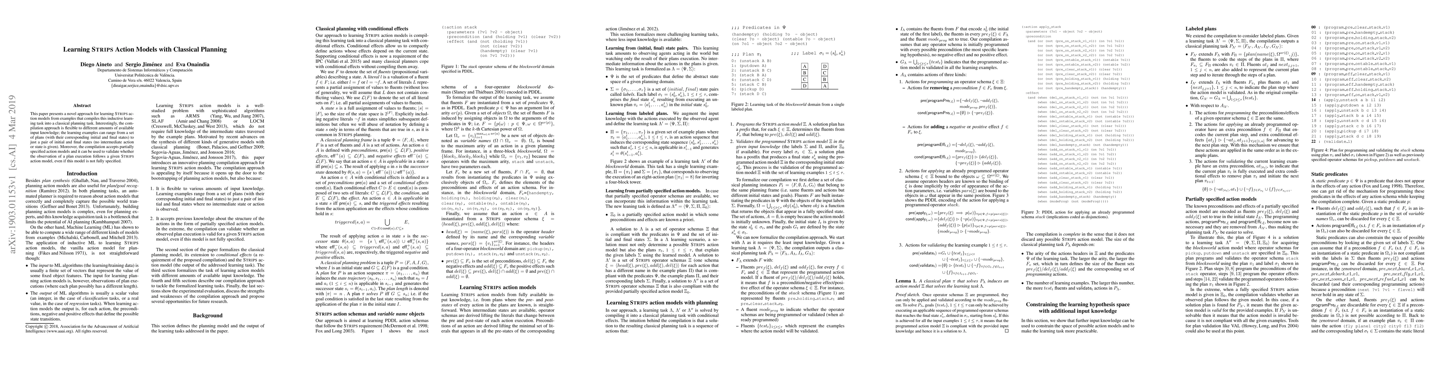 The paper presents a novel approach for learning STRIPS action models from examples by compiling the inductive learning task into a classical planning task. The approach is flexible to varying amounts of input knowledge, ranging from plans with initial and final states to just initial and final states. It can handle partially specified action models and validate if an observed plan execution follows a given STRIPS action model.