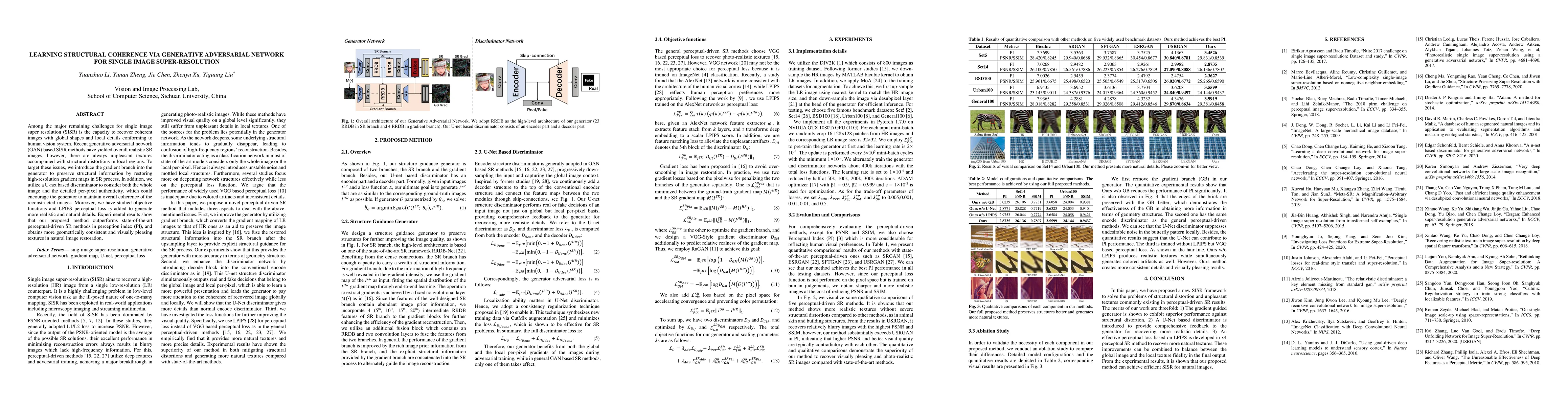 This paper proposes a GAN-based method for single image super-resolution that incorporates a gradient branch to preserve structural information and a U-net discriminator for detailed per-pixel authenticity. The addition of LPIPS perceptual loss enhances realistic and natural details, resulting in superior performance compared to state-of-the-art methods.