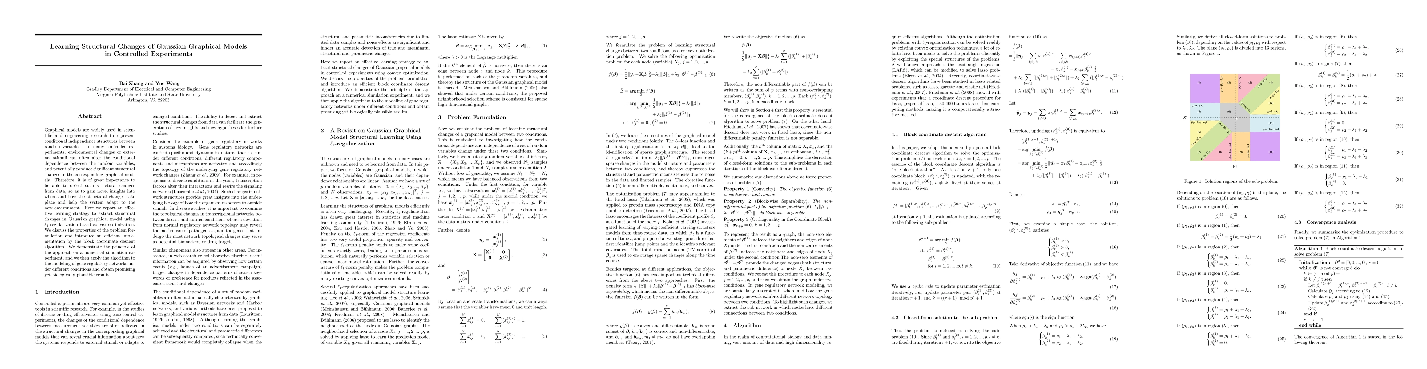 Graphical models are widely used in scienti fic and engineering research to represent conditional independence structures between random variables. In many controlled experiments, environmental changes or external stimuli can often alter the conditional dependence between the random variables, and potentially produce significant structural changes in the corresponding graphical models. Therefore, it is of great importance to be able to detect such structural changes from data, so as to gain novel insights into where and how the structural changes take place and help the system adapt to the new environment. Here we report an effective learning strategy to extract structural changes in Gaussian graphical model using l1-regularization based convex optimization. We discuss the properties of the problem formulation and introduce an efficient implementation by the block coordinate descent algorithm. We demonstrate the principle of the approach on a numerical simulation experiment, and we then apply the algorithm to the modeling of gene regulatory networks under different conditions and obtain promising yet biologically plausible results.