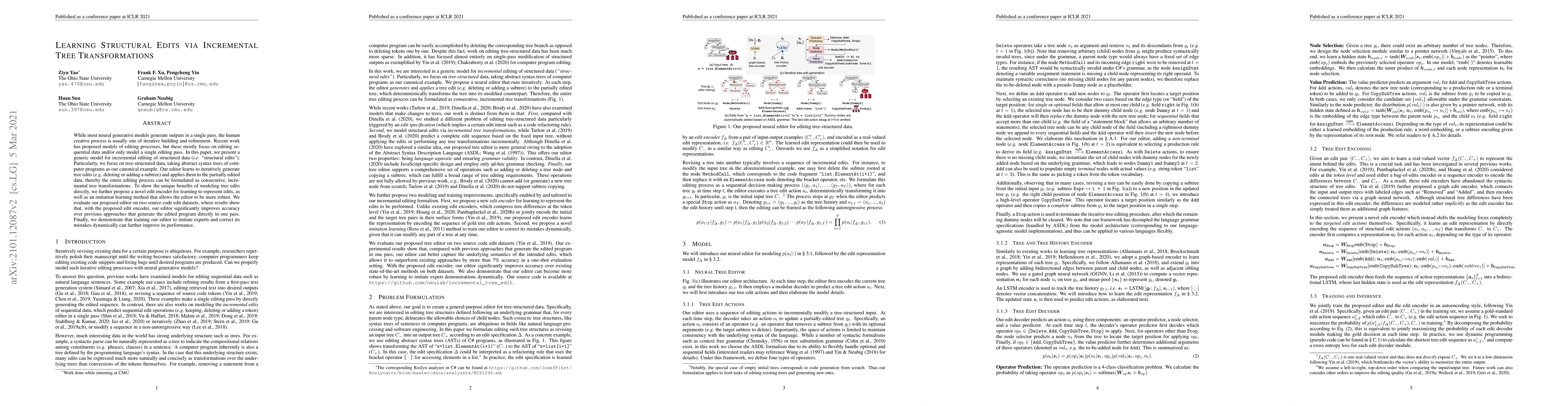 This paper introduces a model for incremental editing of tree-structured data, specifically abstract syntax trees of computer programs, through iterative tree transformations. The proposed editor learns to apply structural edits and demonstrates improved accuracy over single-pass generative models, especially when trained with an edit encoder and imitation learning techniques.