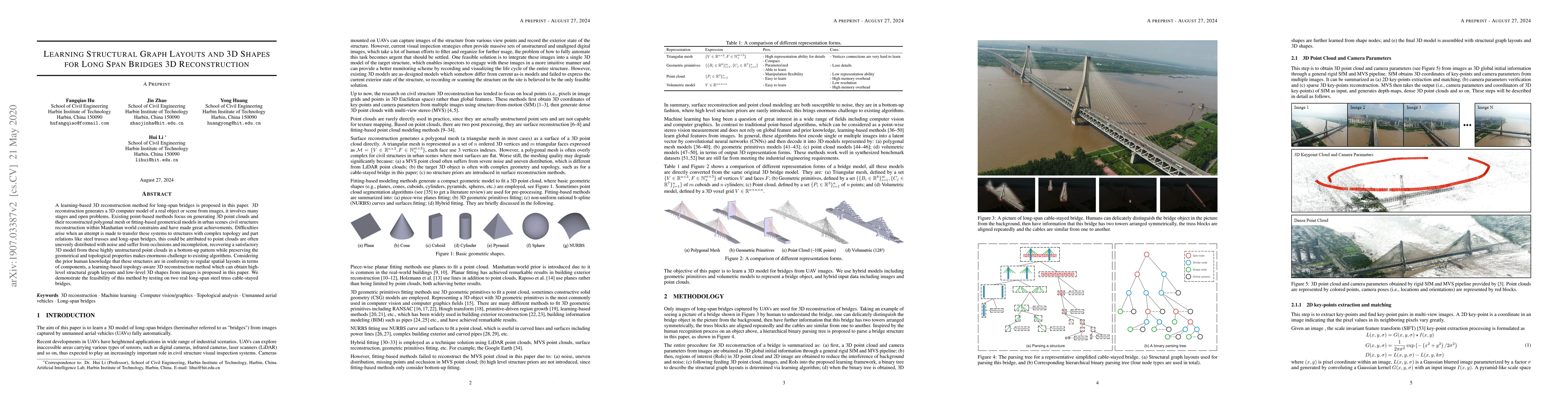 A learning-based 3D reconstruction method for long-span bridges is proposed in this paper. 3D reconstruction generates a 3D computer model of a real object or scene from images, it involves many stages and open problems. Existing point-based methods focus on generating 3D point clouds and their reconstructed polygonal mesh or fitting-based geometrical models in urban scenes civil structures reconstruction within Manhattan world constrains and have made great achievements. Difficulties arise when an attempt is made to transfer these systems to structures with complex topology and part relations like steel trusses and long-span bridges, this could be attributed to point clouds are often unevenly distributed with noise and suffer from occlusions and incompletion, recovering a satisfactory 3D model from these highly unstructured point clouds in a bottom-up pattern while preserving the geometrical and topological properties makes enormous challenge to existing algorithms. Considering the prior human knowledge that these structures are in conformity to regular spatial layouts in terms of components, a learning-based topology-aware 3D reconstruction method which can obtain high-level structural graph layouts and low-level 3D shapes from images is proposed in this paper. We demonstrate the feasibility of this method by testing on two real long-span steel truss cable-stayed bridges.