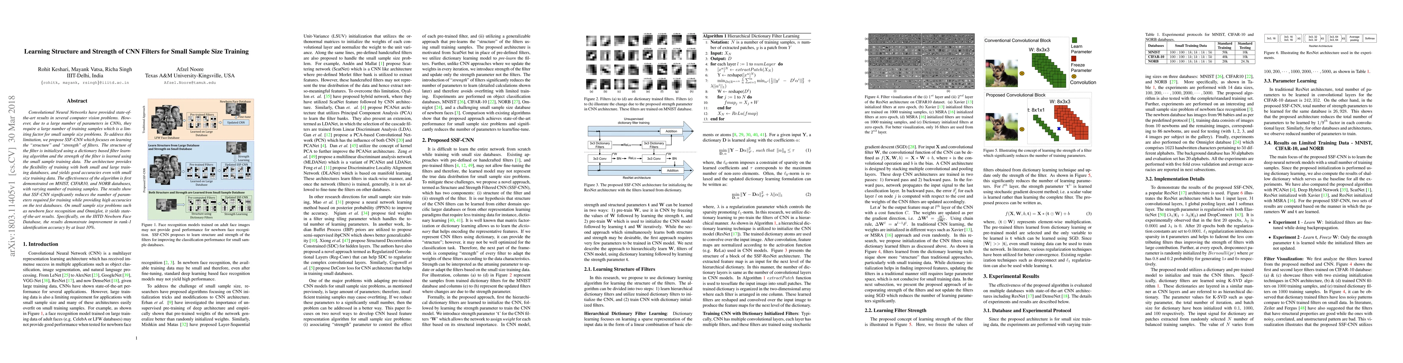 Convolutional Neural Networks have provided state-of-the-art results in several computer vision problems. However, due to a large number of parameters in CNNs, they require a large number of training samples which is a limiting factor for small sample size problems. To address this limitation, we propose SSF-CNN which focuses on learning the structure and strength of filters. The structure of the filter is initialized using a dictionary-based filter learning algorithm and the strength of the filter is learned using the small sample training data. The architecture provides the flexibility of training with both small and large training databases and yields good accuracies even with small size training data. The effectiveness of the algorithm is first demonstrated on MNIST, CIFAR10, and NORB databases, with a varying number of training samples. The results show that SSF-CNN significantly reduces the number of parameters required for training while providing high accuracies the test databases. On small sample size problems such as newborn face recognition and Omniglot, it yields state-of-the-art results. Specifically, on the IIITD Newborn Face Database, the results demonstrate improvement in rank-1 identification accuracy by at least 10%.
