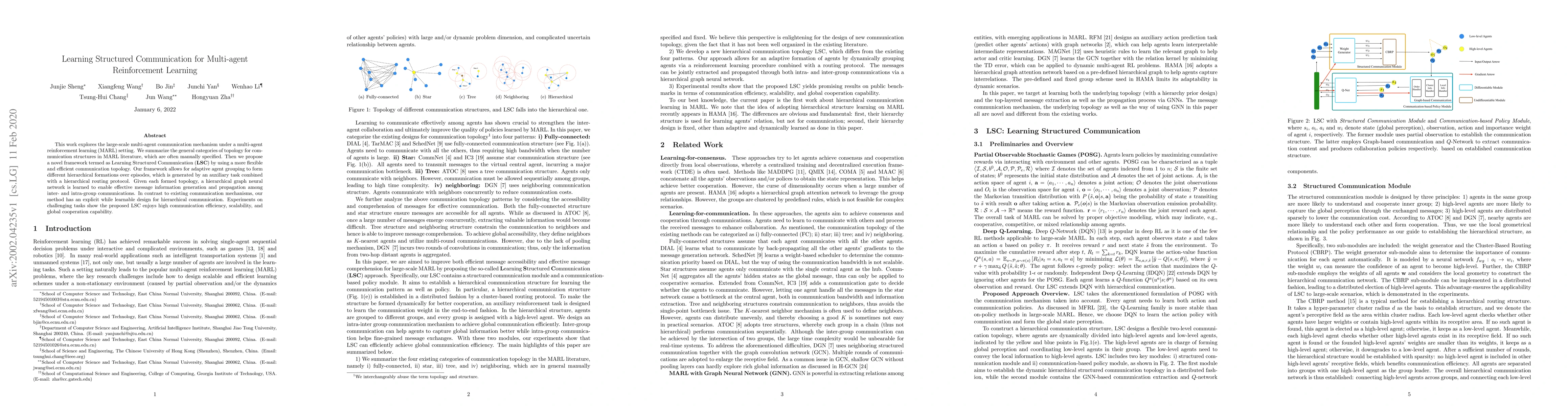 This paper proposes a Learning Structured Communication (LSC) framework for multi-agent reinforcement learning, introducing adaptive agent grouping and hierarchical routing protocols to enhance communication efficiency and scalability. The framework utilizes a hierarchical graph neural network for effective message propagation, demonstrating improved global cooperation and performance in experiments.