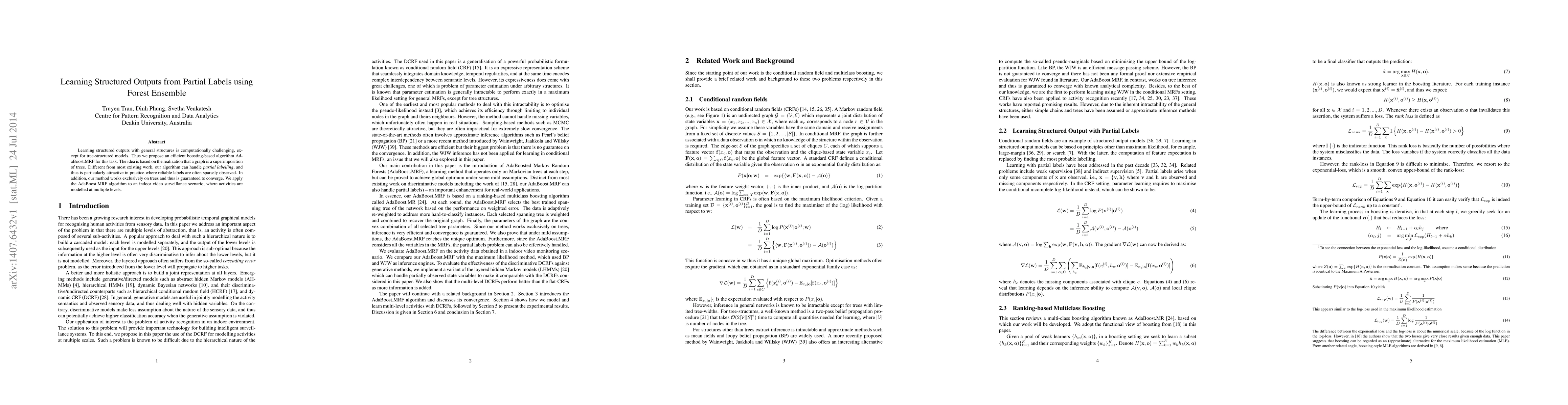 Learning structured outputs with general structures is computationally challenging, except for tree-structured models. Thus we propose an efficient boosting-based algorithm AdaBoost.MRF for this task. The idea is based on the realization that a graph is a superimposition of trees. Different from most existing work, our algorithm can handle partial labelling, and thus is particularly attractive in practice where reliable labels are often sparsely observed. In addition, our method works exclusively on trees and thus is guaranteed to converge. We apply the AdaBoost.MRF algorithm to an indoor video surveillance scenario, where activities are modelled at multiple levels.