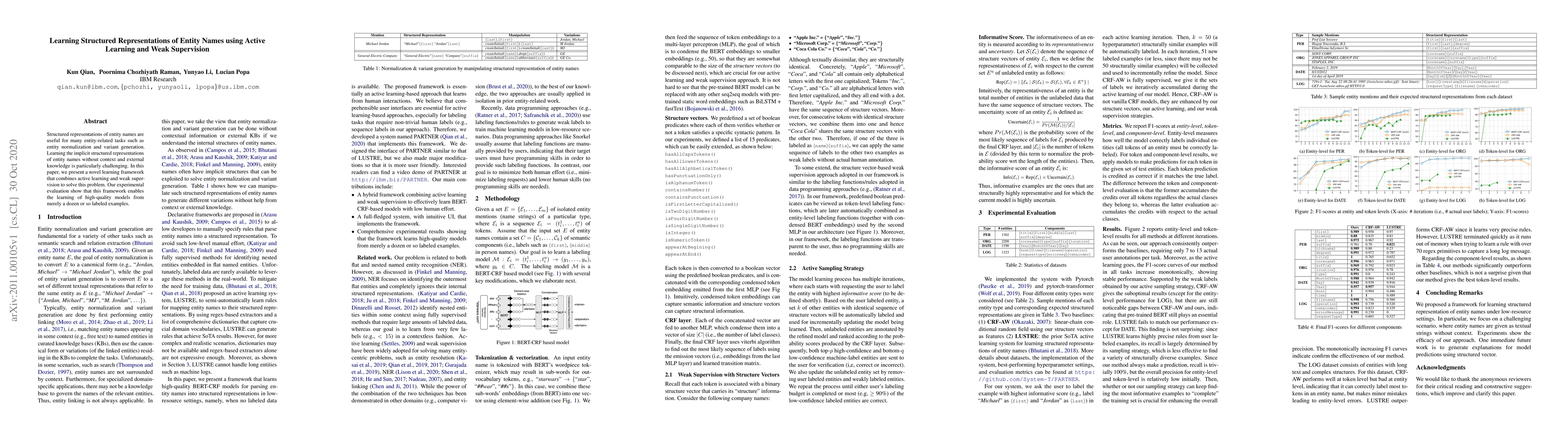 This paper introduces a novel framework that uses active learning and weak supervision to learn structured representations of entity names from minimal labeled data, demonstrating high-quality model performance with just a few examples.