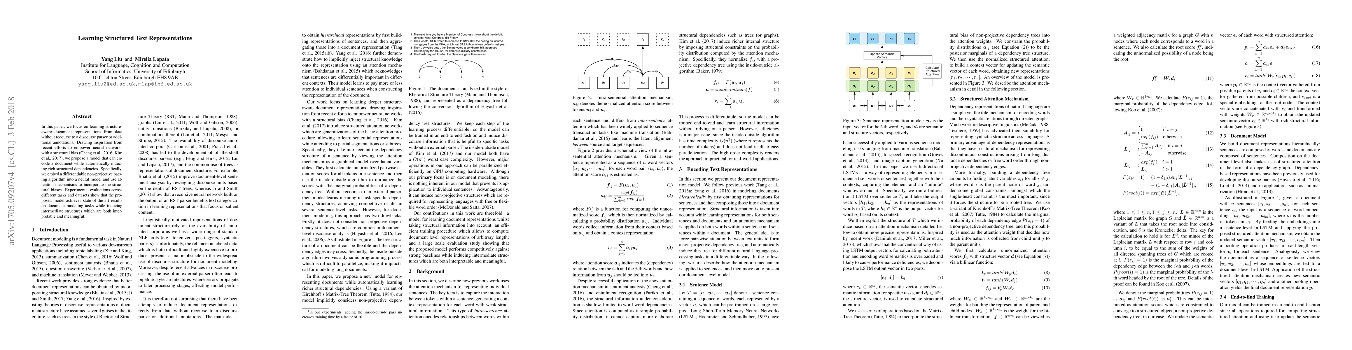 A new model learns structured text representations without additional annotations, achieving state-of-the-art results in document modeling tasks while inducing interpretable structures.