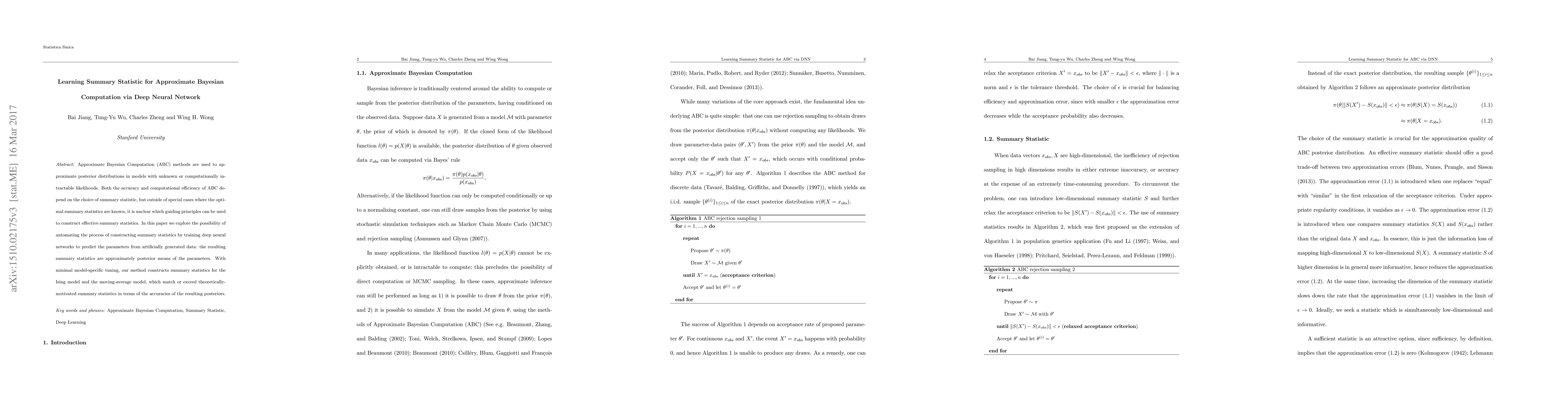 This paper proposes using deep neural networks to automate the construction of summary statistics for Approximate Bayesian Computation (ABC), achieving accurate posterior approximations with minimal model-specific tuning. The method is demonstrated to be effective for the Ising model and the moving-average model, matching or surpassing the accuracy of theoretically-motivated summary statistics.