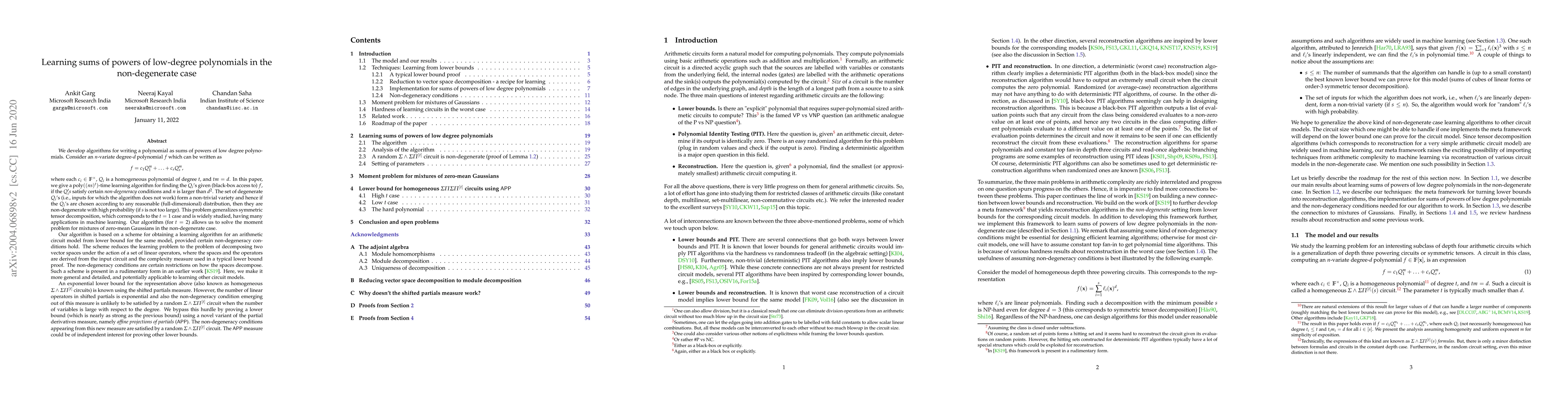 We develop algorithms for writing a polynomial as sums of powers of low degree polynomials. Consider an $n$-variate degree-$d$ polynomial $f$ which can be written as $$f = c_1Q_1^{m} + \ldots + c_s Q_s^{m},$$ where each $c_i\in \mathbb{F}^{\times}$, $Q_i$ is a homogeneous polynomial of degree $t$, and $t m = d$. In this paper, we give a $\text{poly}((ns)^t)$-time learning algorithm for finding the $Q_i$'s given (black-box access to) $f$, if the $Q_i's$ satisfy certain non-degeneracy conditions and $n$ is larger than $d^2$. The set of degenerate $Q_i$'s (i.e., inputs for which the algorithm does not work) form a non-trivial variety and hence if the $Q_i$'s are chosen according to any reasonable (full-dimensional) distribution, then they are non-degenerate with high probability (if $s$ is not too large). Our algorithm is based on a scheme for obtaining a learning algorithm for an arithmetic circuit model from a lower bound for the same model, provided certain non-degeneracy conditions hold. The scheme reduces the learning problem to the problem of decomposing two vector spaces under the action of a set of linear operators, where the spaces and the operators are derived from the input circuit and the complexity measure used in a typical lower bound proof. The non-degeneracy conditions are certain restrictions on how the spaces decompose.