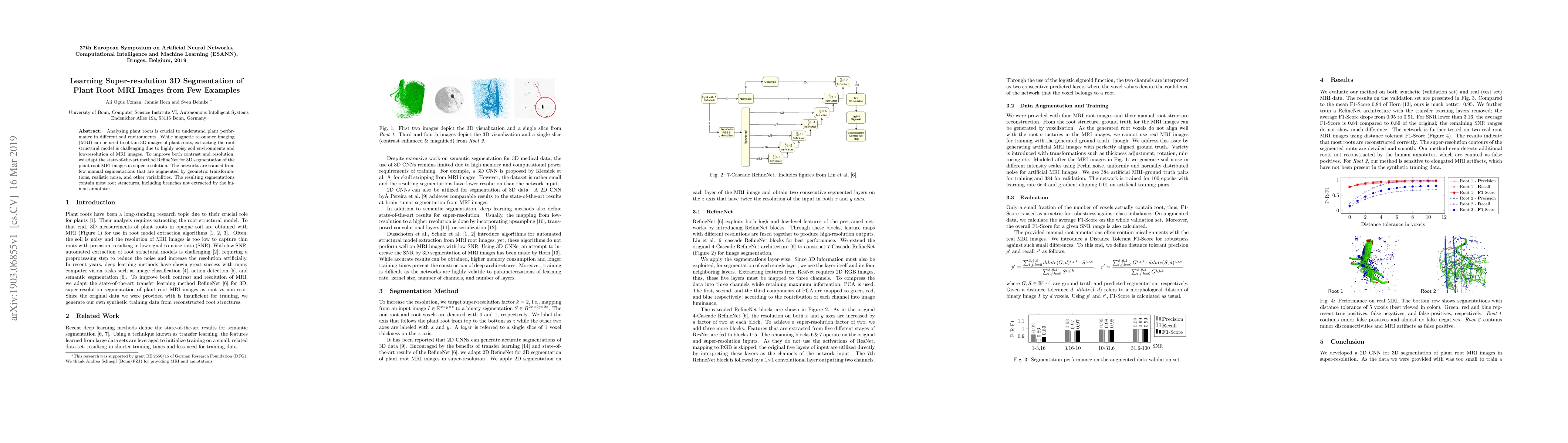 This paper proposes an advanced method using RefineNet for super-resolution 3D segmentation of plant root MRI images, trained from few examples and augmented with transformations and noise. The approach effectively extracts detailed root structures, including branches, surpassing human annotators.