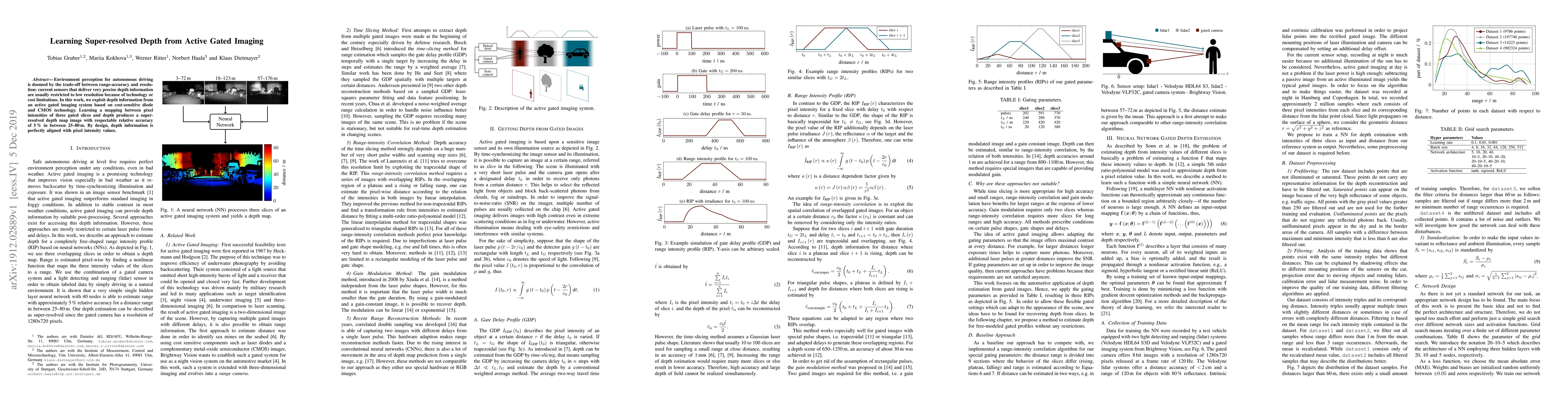 Environment perception for autonomous driving is doomed by the trade-off between range-accuracy and resolution: current sensors that deliver very precise depth information are usually restricted to low resolution because of technology or cost limitations. In this work, we exploit depth information from an active gated imaging system based on cost-sensitive diode and CMOS technology. Learning a mapping between pixel intensities of three gated slices and depth produces a super-resolved depth map image with respectable relative accuracy of 5% in between 25-80 m. By design, depth information is perfectly aligned with pixel intensity values.