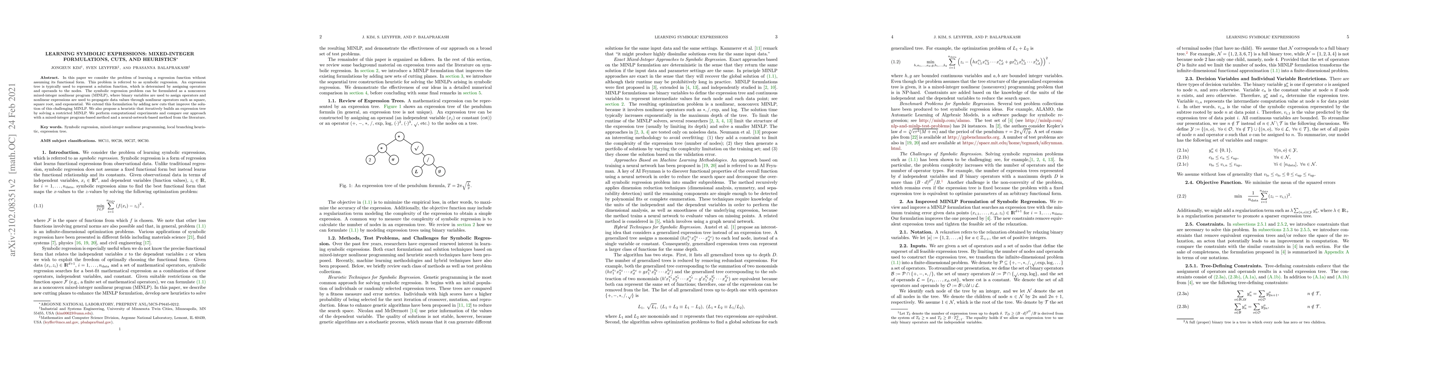 This paper addresses symbolic regression using a nonconvex mixed-integer nonlinear program (MINLP) to determine expression trees. It introduces new cuts and a heuristic to improve MINLP solutions, and compares its performance with existing mixed-integer and neural-network methods.