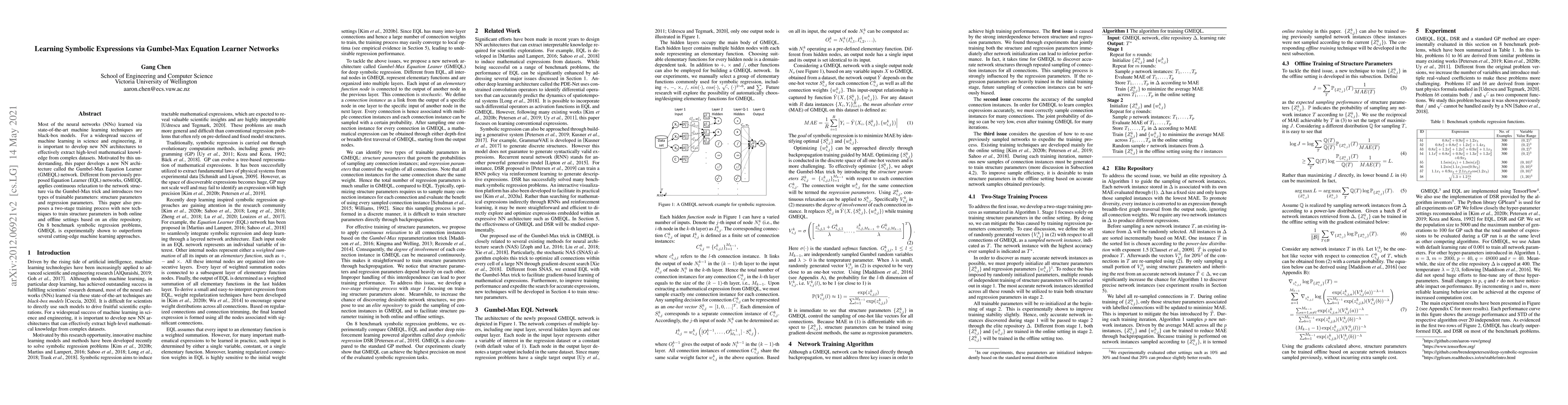 Most of the neural networks (NNs) learned via state-of-the-art machine learning techniques are black-box models. For a widespread success of machine learning in science and engineering, it is important to develop new NN architectures to effectively extract high-level mathematical knowledge from complex datasets. Motivated by this understanding, this paper develops a new NN architecture called the Gumbel-Max Equation Learner (GMEQL) network. Different from previously proposed Equation Learner (EQL) networks, GMEQL applies continuous relaxation to the network structure via the Gumbel-Max trick and introduces two types of trainable parameters: structure parameters and regression parameters. This paper also proposes a two-stage training process with new techniques to train structure parameters in both online and offline settings based on an elite repository. On 8 benchmark symbolic regression problems, GMEQL is experimentally shown to outperform several cutting-edge machine learning approaches.