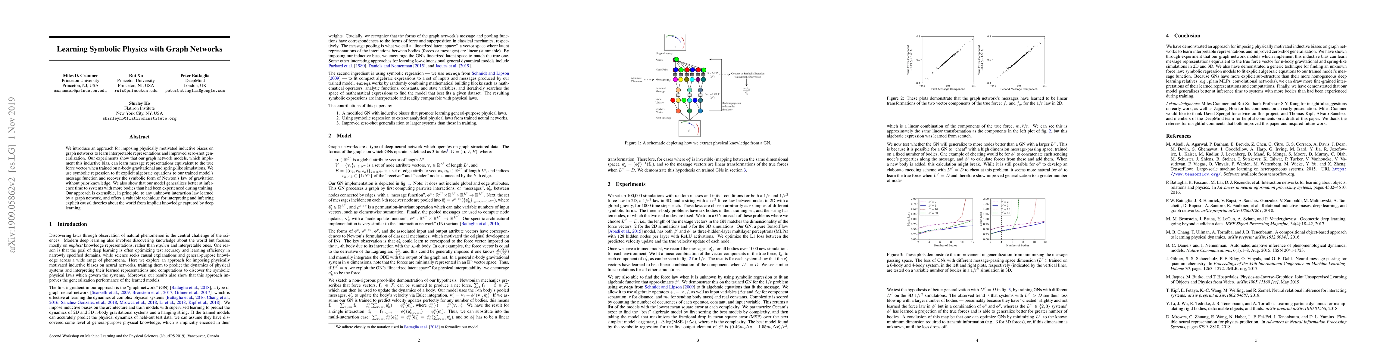 We introduce an approach for imposing physically motivated inductive biases on graph networks to learn interpretable representations and improved zero-shot generalization. Our experiments show that our graph network models, which implement this inductive bias, can learn message representations equivalent to the true force vector when trained on n-body gravitational and spring-like simulations. We use symbolic regression to fit explicit algebraic equations to our trained model's message function and recover the symbolic form of Newton's law of gravitation without prior knowledge. We also show that our model generalizes better at inference time to systems with more bodies than had been experienced during training. Our approach is extensible, in principle, to any unknown interaction law learned by a graph network, and offers a valuable technique for interpreting and inferring explicit causal theories about the world from implicit knowledge captured by deep learning.