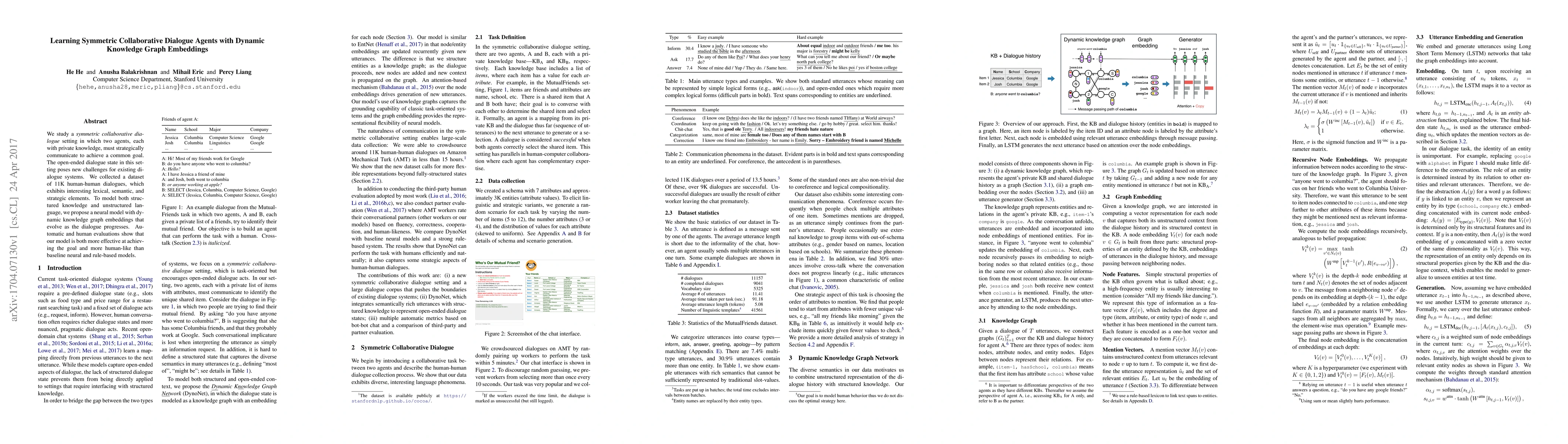 This paper proposes a neural model for symmetric collaborative dialogue agents that use dynamic knowledge graph embeddings to handle open-ended dialogue states. The model outperforms baselines in achieving common goals and exhibits more human-like communication, as demonstrated by both automatic and human evaluations.