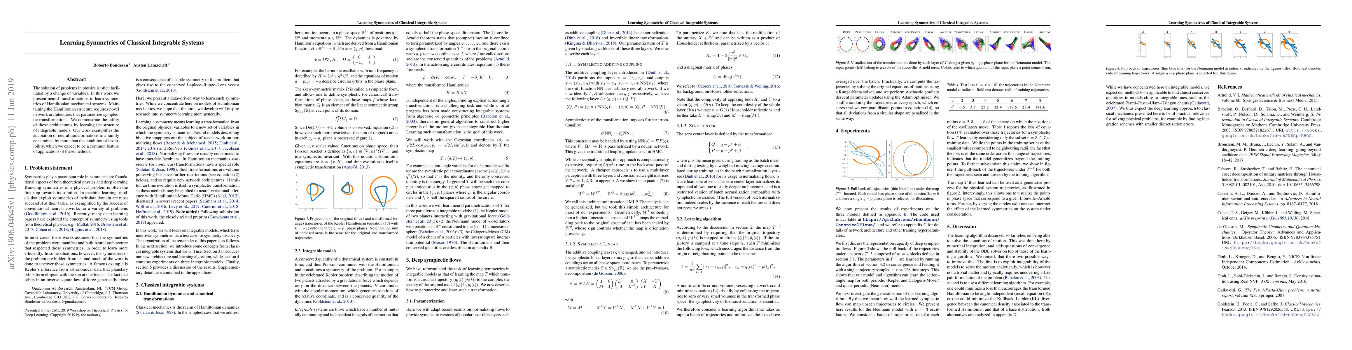 The solution of problems in physics is often facilitated by a change of variables. In this work we present neural transformations to learn symmetries of Hamiltonian mechanical systems. Maintaining the Hamiltonian structure requires novel network architectures that parametrize symplectic transformations. We demonstrate the utility of these architectures by learning the structure of integrable models. Our work exemplifies the adaptation of neural transformations to a family constrained by more than the condition of invertibility, which we expect to be a common feature of applications of these methods.